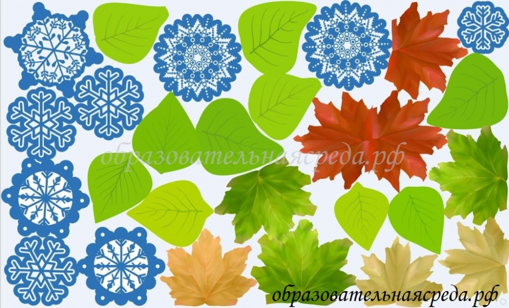 Элементы для оформления дерева выполнены из ПЭТ. В компект входит 20 зеленых листиков березы, 20 снежинок, 20 осенних кленовых листиков итого 60 элементов. Размер одного элемента приблизительно 20*20 см.