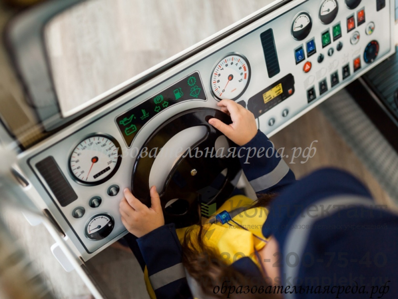 Высота игрового модуля 1,1м, ширина створок 0,85м. Модуль имеет окна в центральной и боковых створках, что позволяет организовывать различные игры с большим количеством воспитанников. Так же игровой модуль оснащен зеркалами заднего вида, панелью управления и вращающимся рулем.