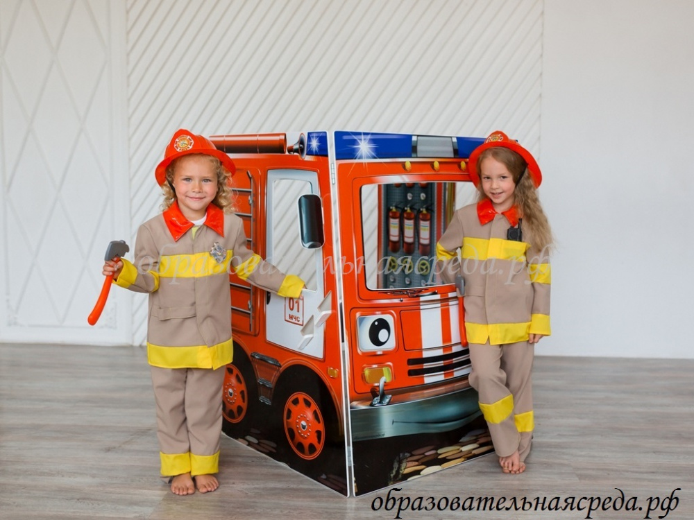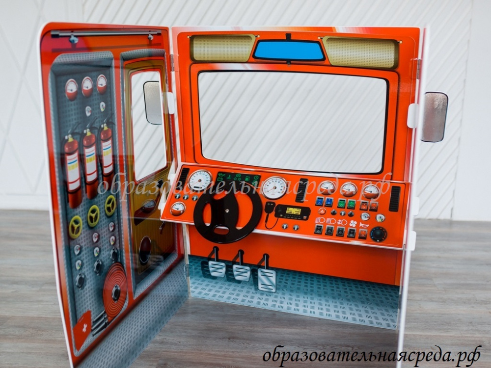 Игровой модуль "Пожарная машина" выполнен из МДФ с нанесением полноцветного рисунка и ламинацией снаружи и внутри изделия.