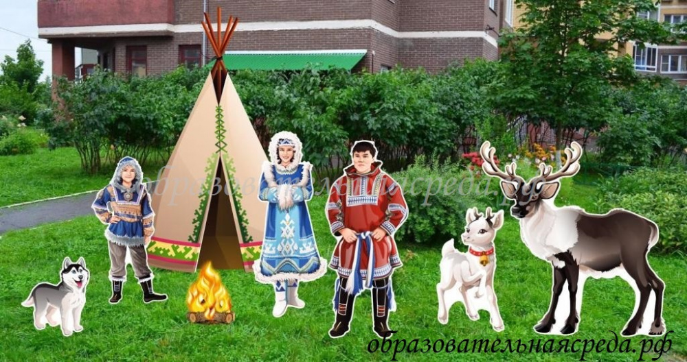 Композиция уличных фигур "Хантыйское стойбище" состоит из семи отдельностоящих фигур: семьи хантов, хаски, двух северных оленей, костра и объемного чума. Фигуры выполнены из ПВХ с нанесением полноцветного рисунка, покрытого защитной пленкой. Объемный чум состоит из металлического каркаса, обтянутого баннерной тканью окрашенной в цвет шкуры с нанесенным этническим узором. Используемые материалы безопасны и устойчивы к атмосферным воздействиям, а конструкция гарантирует долговременное использование.
