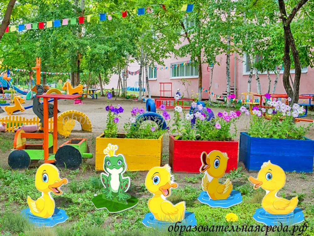 Композиция уличных фигур "Весёлые утята" состоит из четырех утят сидящих в лужах и зелёной лягушки сидящей на листе кувшинки.