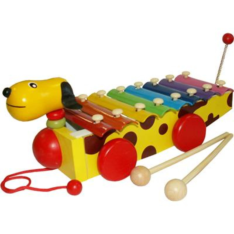 Металлофон -каталка. На деревянном основании закреплены металлические пластинки.Ударяя по разным пластинкам деревянными палочками, ребенок извлекает разные звуки, учится сочетать их, складывает в ритмы и мелодии.