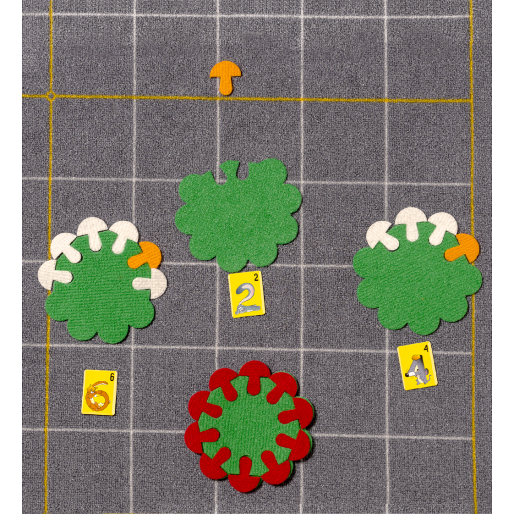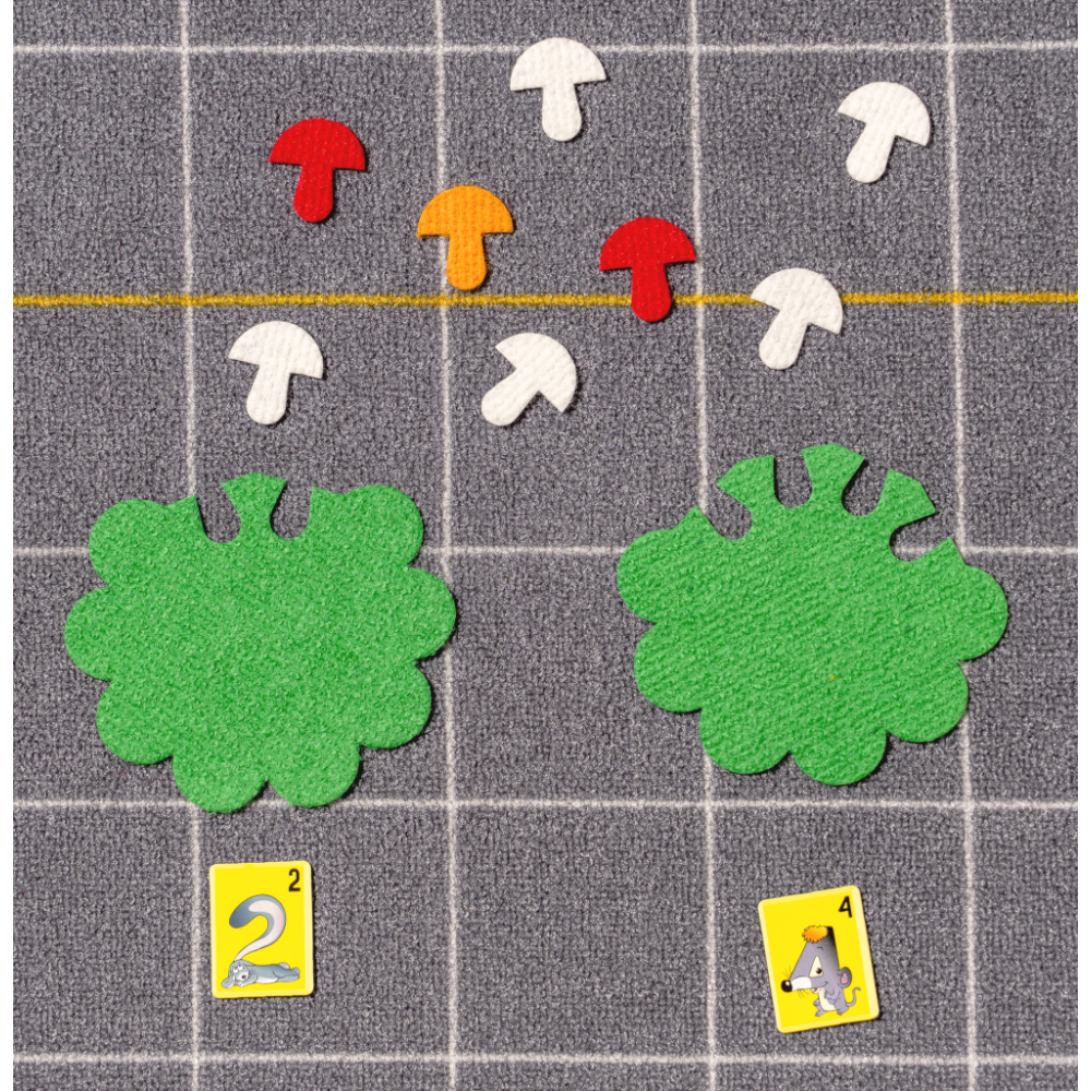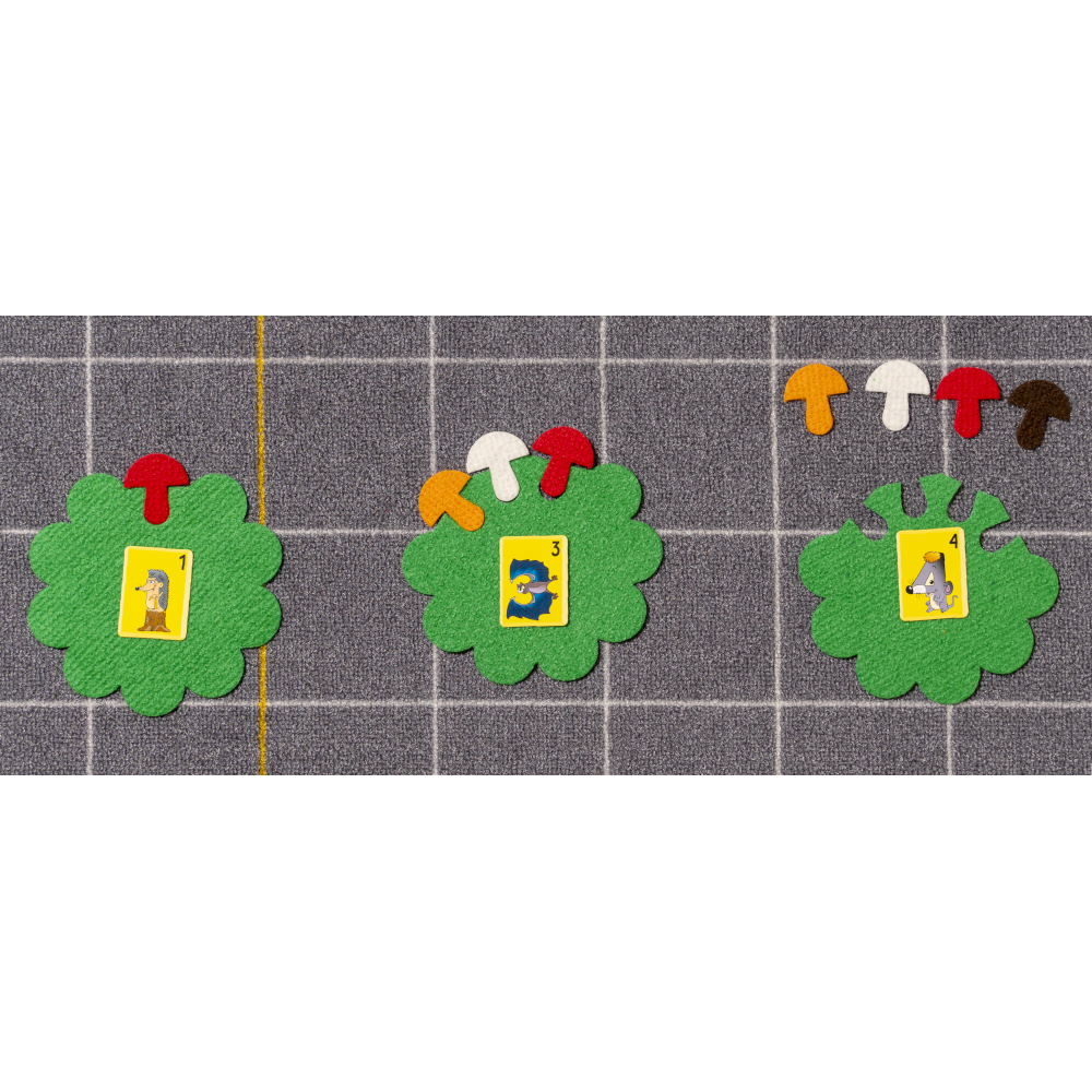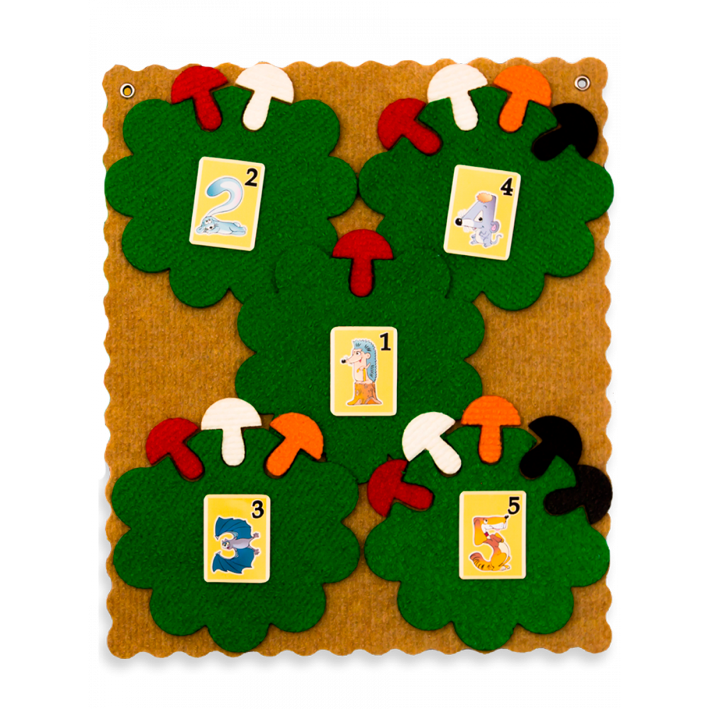 Размеры: подложка 290х350 мм, корзинки 150х150 мм, грибки 35х40мм, набор карточек «Забавные цифры» 32х62 мм