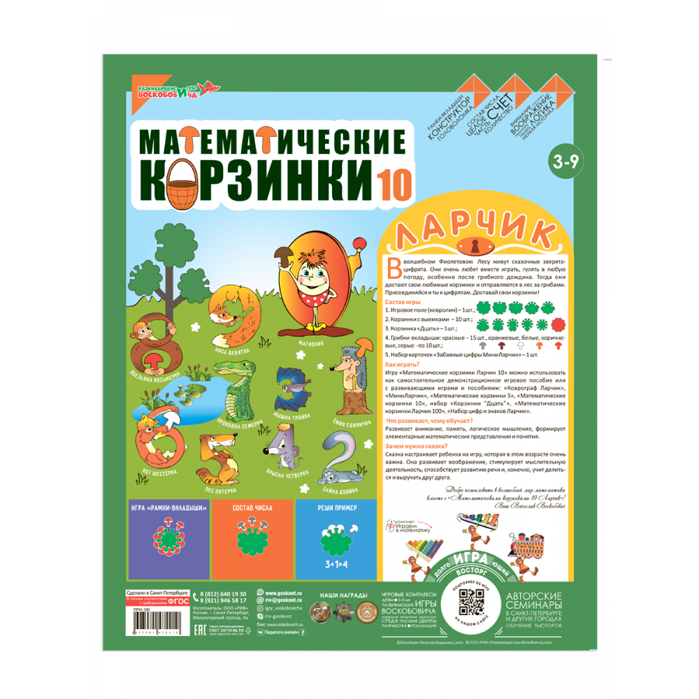 Детали «корзинки» –10шт., корзинка «Дцать..»–1 шт., «грибки»–55 шт., набор «Забавные цифры», подложка (ковролин), цв. инструкция.