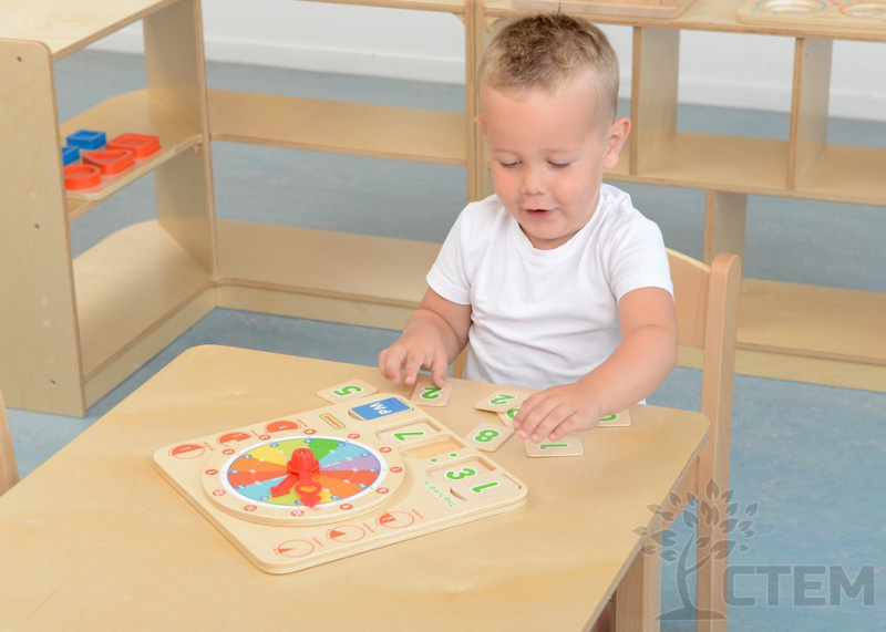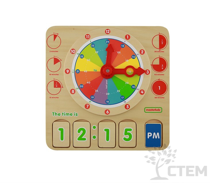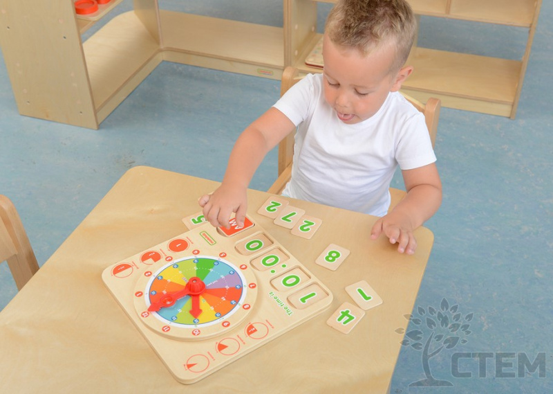 На панели представлен циферблат с минутной и часовой стрелкой, а в нижней части панели расположен слот для размещения деревянных карточек с отображением цифровых значений временных показателей.