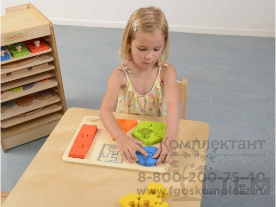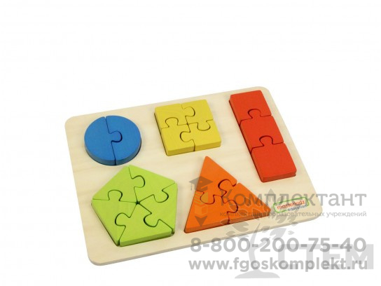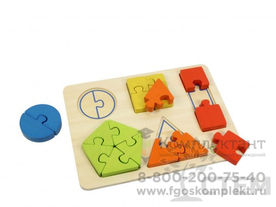 Панель выполнена из березовой фанеры, размер 38 х 28 х 2,5 см. На поверхности панели расположены цветные элементы (пазлы), которые в собранном виде представляют следующие фигуры: круг, квадрат, прямоугольник, треугольник и пятиугольник.