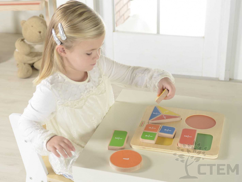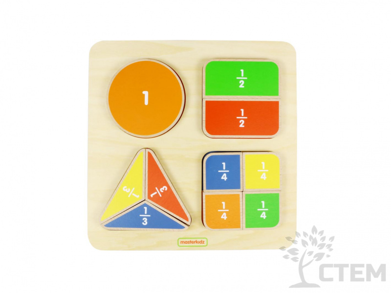Панель представляет из себя игровое пособие для легкого изучения дробей. С одной стороны блока нанесено цифровое обозначение долей. Деревянные блоки изготовлены из экологически чистого европейского бука.