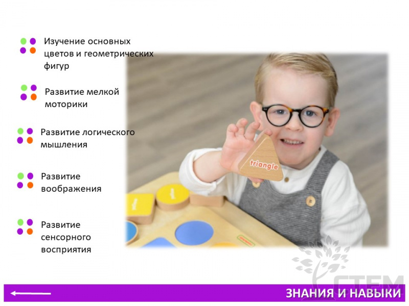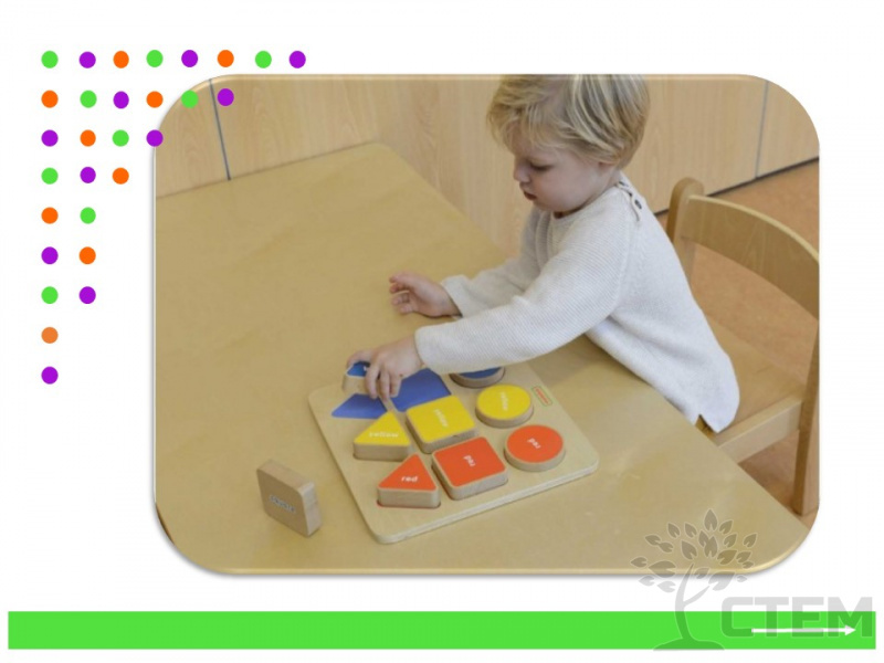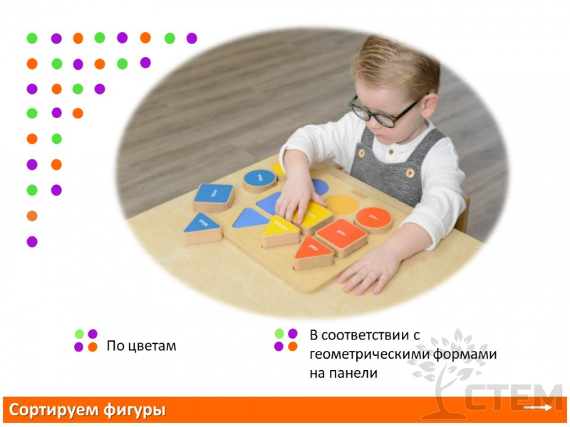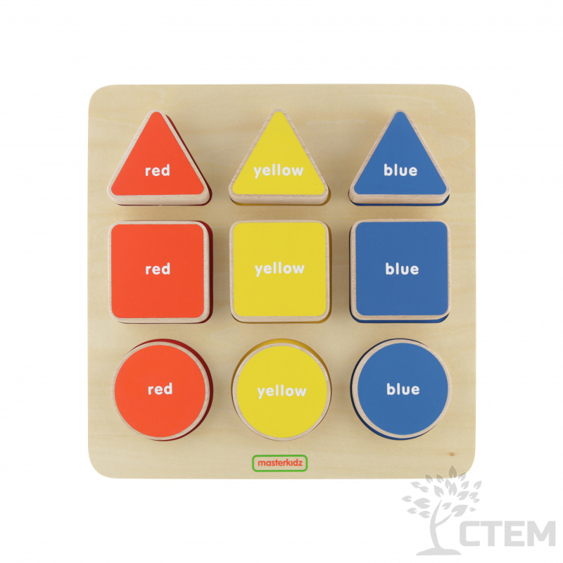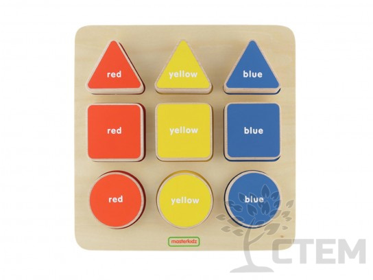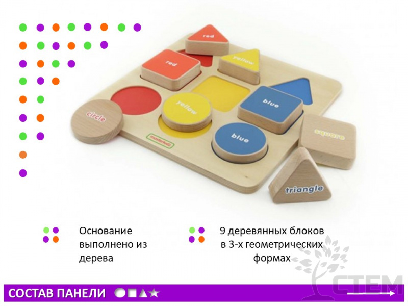 На лицевой стороне панели расположены 9 геометрических фигур: 3 треугольника, 3 круга и 3 квадрата, в 3х цветах: желтый, красный и голубой. Необходимо разместить фигуру в соответствующее по цвету отверстие. На одной стороне фигуры написан цвет, на оборотной стороне название фигуры (на Англ/Яз.).