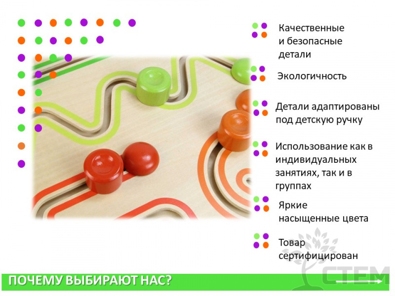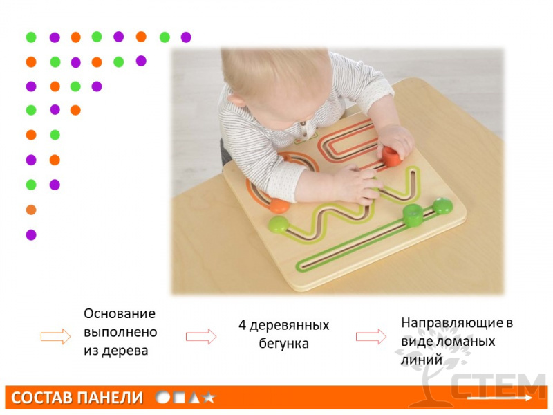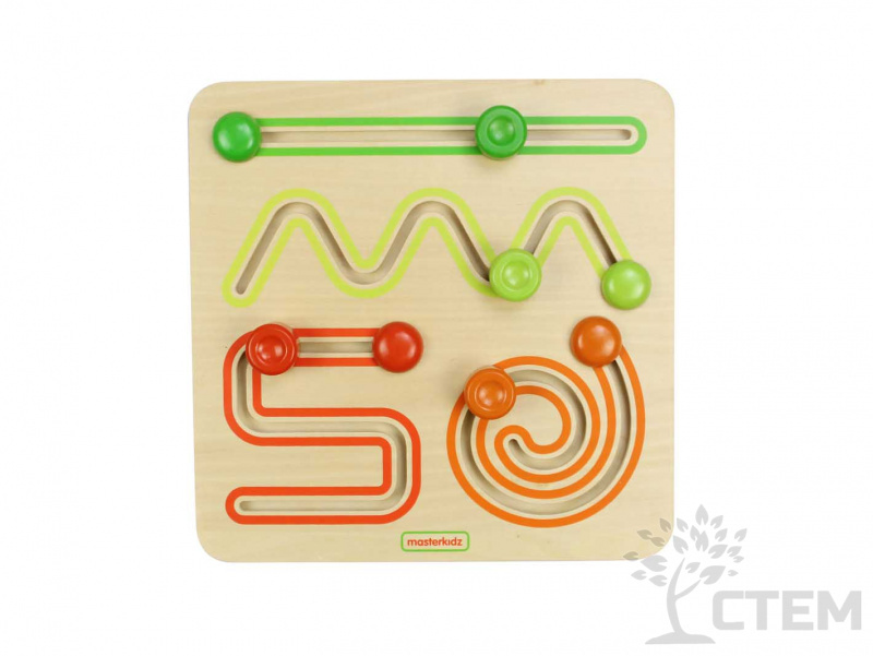 Панель представлена в виде лабиринта, знакомит детей с видами линий. В процессе игры, ребёнок может задействовать две руки одновременно, что способствует развитию правого и левого полушарий мозга или принимать участие двое детей.