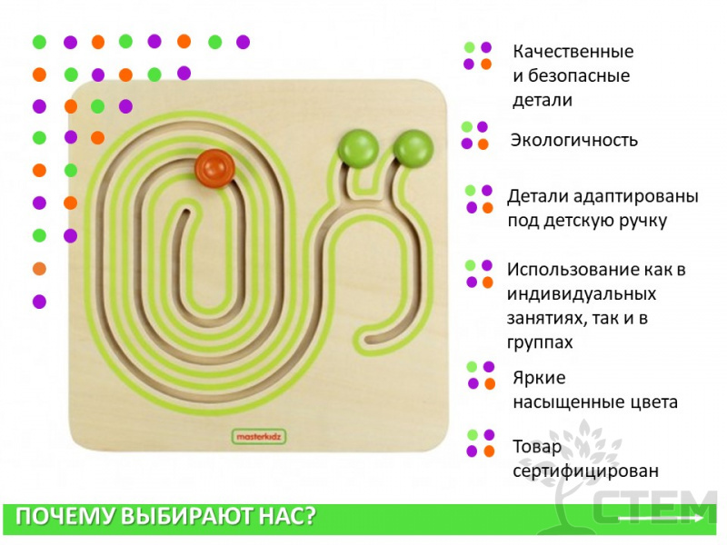 Панель "Лабиринт Улитка" – это уникальная развивающая игрушка для детей, которая стимулирует логическое мышление и координацию движений. Игровой процесс помогает ребенку учиться сосредотачиваться и достигать целей, развивая усидчивость и внимательность.