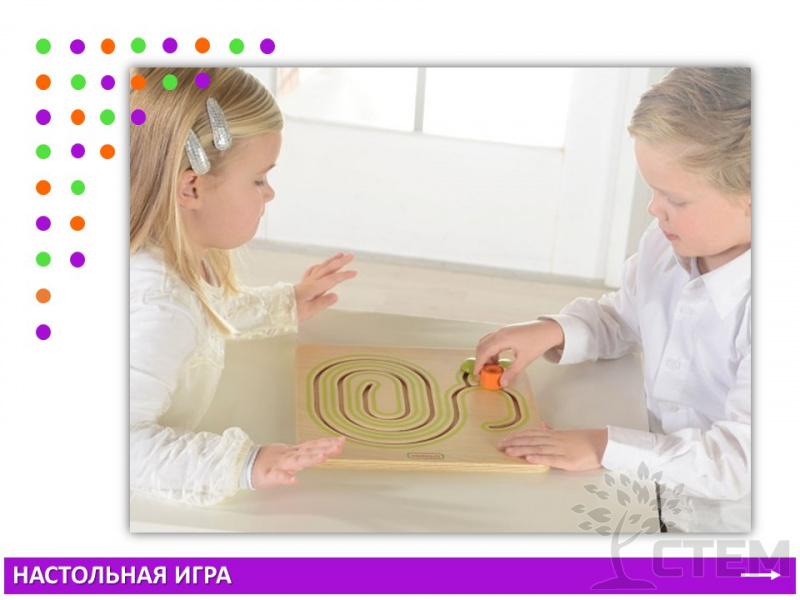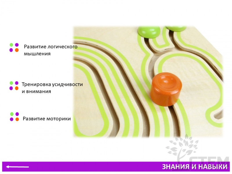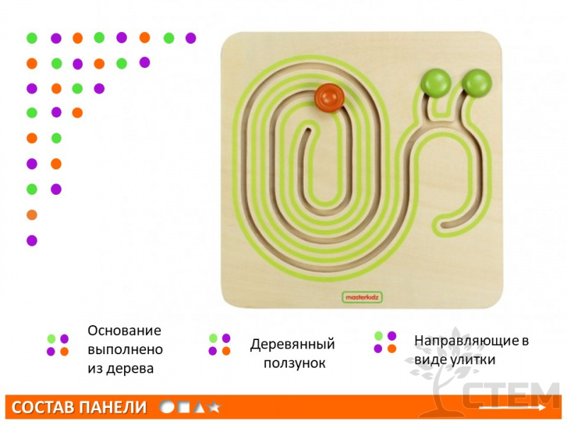 Панель выполнена из березовой фанеры. На лицевой поверхности панели выполнена прорезь-углубление в виде лабиринта-улитки, в прорези подвижно закреплен бегунок красного цвета.