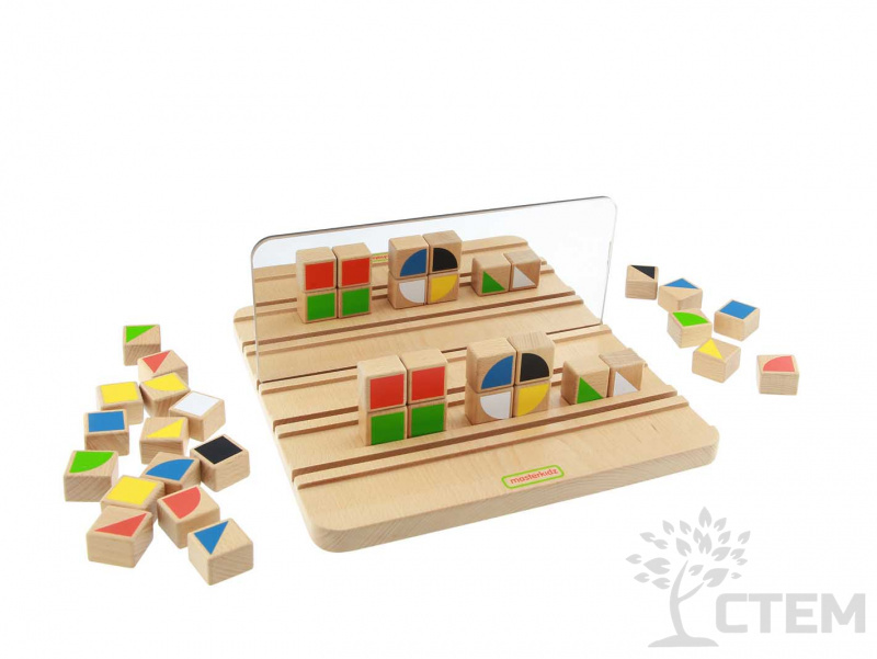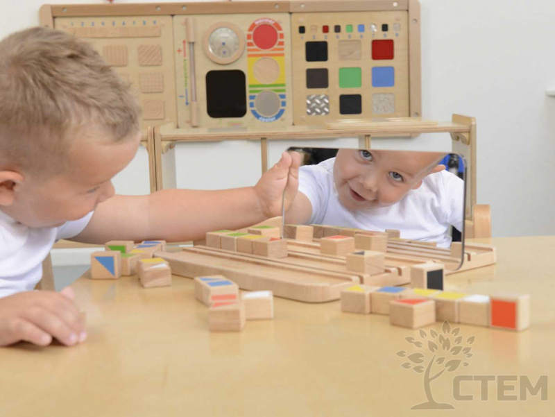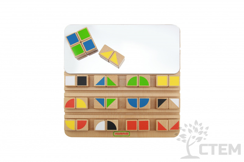 Панель выполнена из березовой фанеры, на лицевой стороне которой расположены 5 слотов, двустороннее зеркало и 30 разноцветных блоков. Панель учит работать с зеркальным отражением