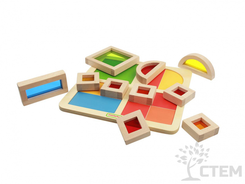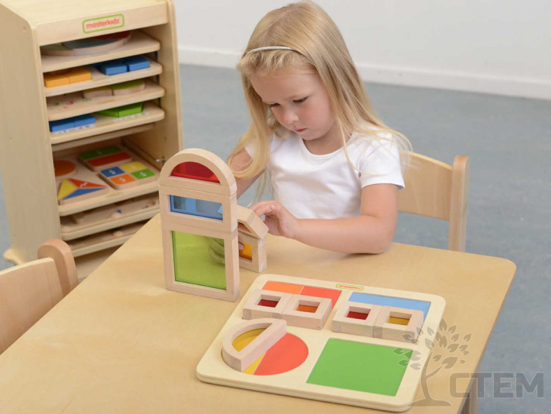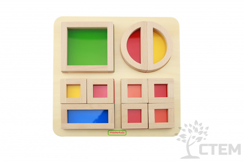 Панель из березовой фанеры, на поверхности которой имеются углубления, в которых расположены съёмные деревянные блоки в форме разноцветных геометрических фигур (полукруга, прямоугольника, квадрата). Фигуры имеют акриловые прозрачные вставки в различных цветах. Используя своё воображение, дети могут создавать различные конструкции из блоков.