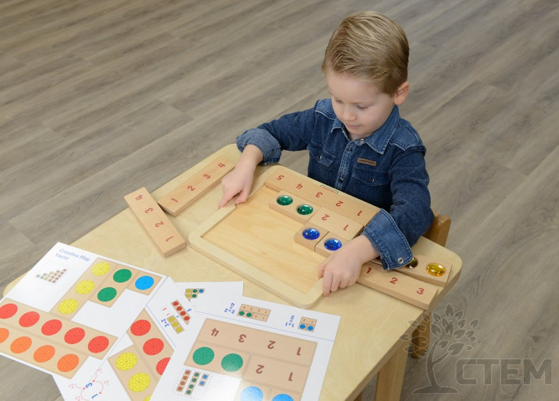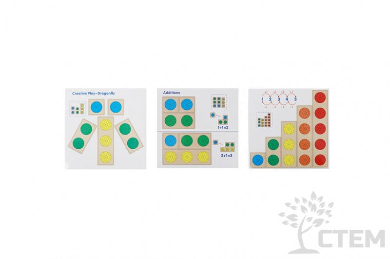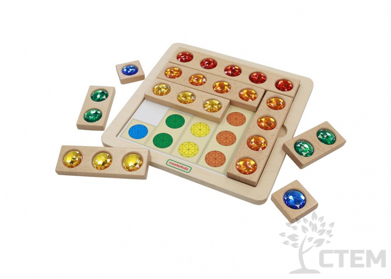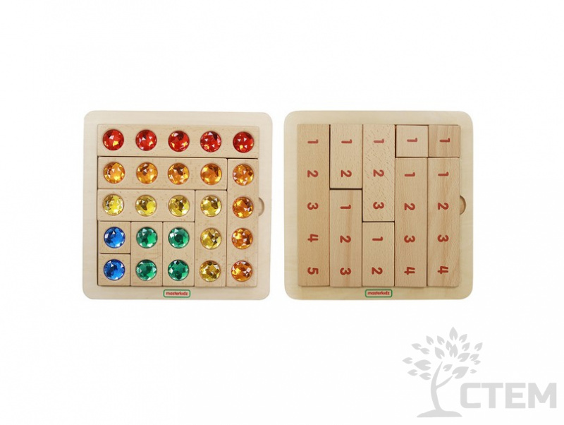 Основание панели выполнено из березовой фанеры, на которой расположен набор из 5 счетных слитков, изготовленных из бука, инкрустированных красочными акриловыми "драгоценными" камнями в 5 цветах. Пособие предназначено для обучения счету от 1 до 5 и изучения цвета.