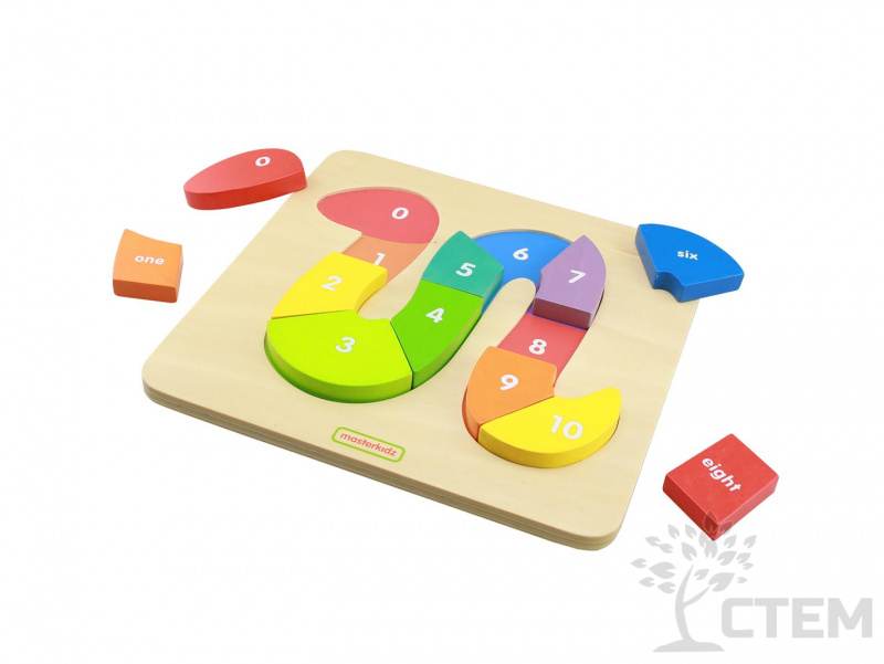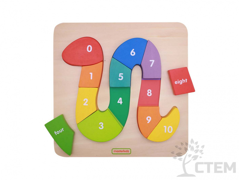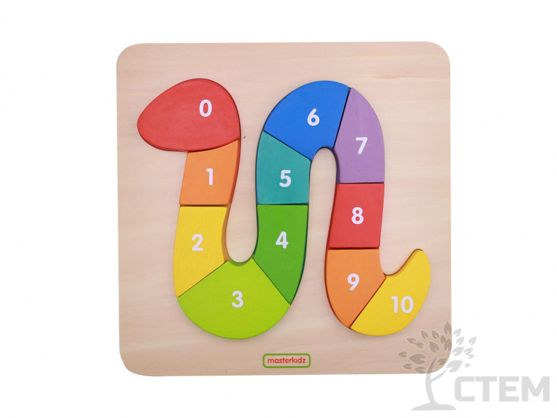 На лицевой стороне панели изображена головоломка в форме змеи, состоящая из из 10 разноцветных блоков, пронумерованных от 1 до 10. Ребенок в правильной последовательности должен расположить части головоломки, чтобы собрать змею. Панель предназначена для обучения счету от 0 до 10 и знакомства с цветами.