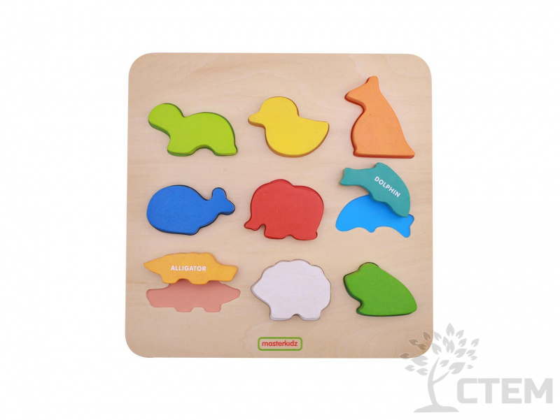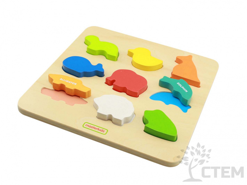 Учебная панель знакомит детей с цветом, видами животных и развивает навыки сортировки (по цвету, форме). 9 видов животных и 9 соответствующих по форме отверстий.