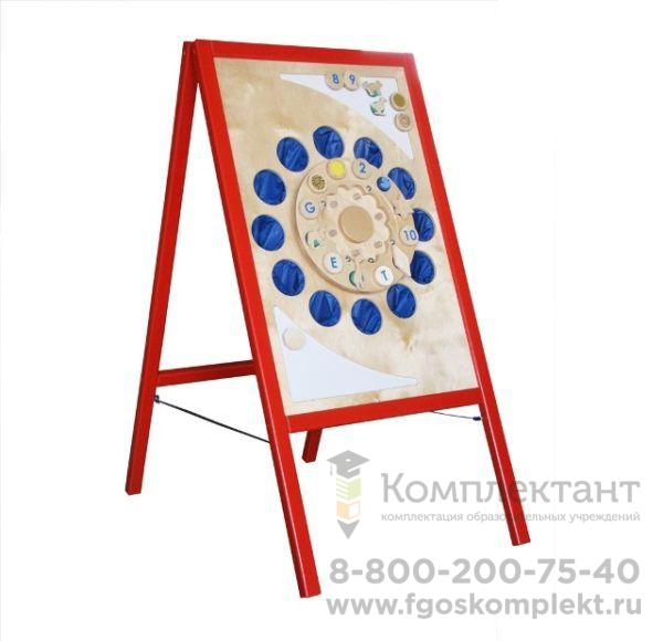перемещающимся металлическим «указателем» - шариком и вокруг по диску 12 кружочков - магнитов для прикрепления пособий на магнитах; вокруг «рулетки» - диска