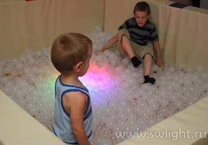 Каркас сухого бассейна изготовлен из высококачественной фанеры толщиной 9мм, обшитой поролоном. Материал стенок: ПВХ. Для выбора цвета подсветки сухого бассейна используются клавиши-переключатели черырех цветов, которые на проводах могут быть как вынесены на стенки бассейна, так и установлены за его пределами на полу. В состав также входит система подсветки, которая содержит электронное устройство управления, позволяющее автоматически переключать цвета подсветки без клавиш.