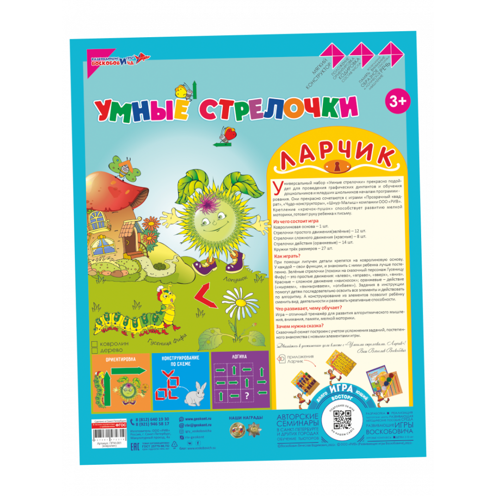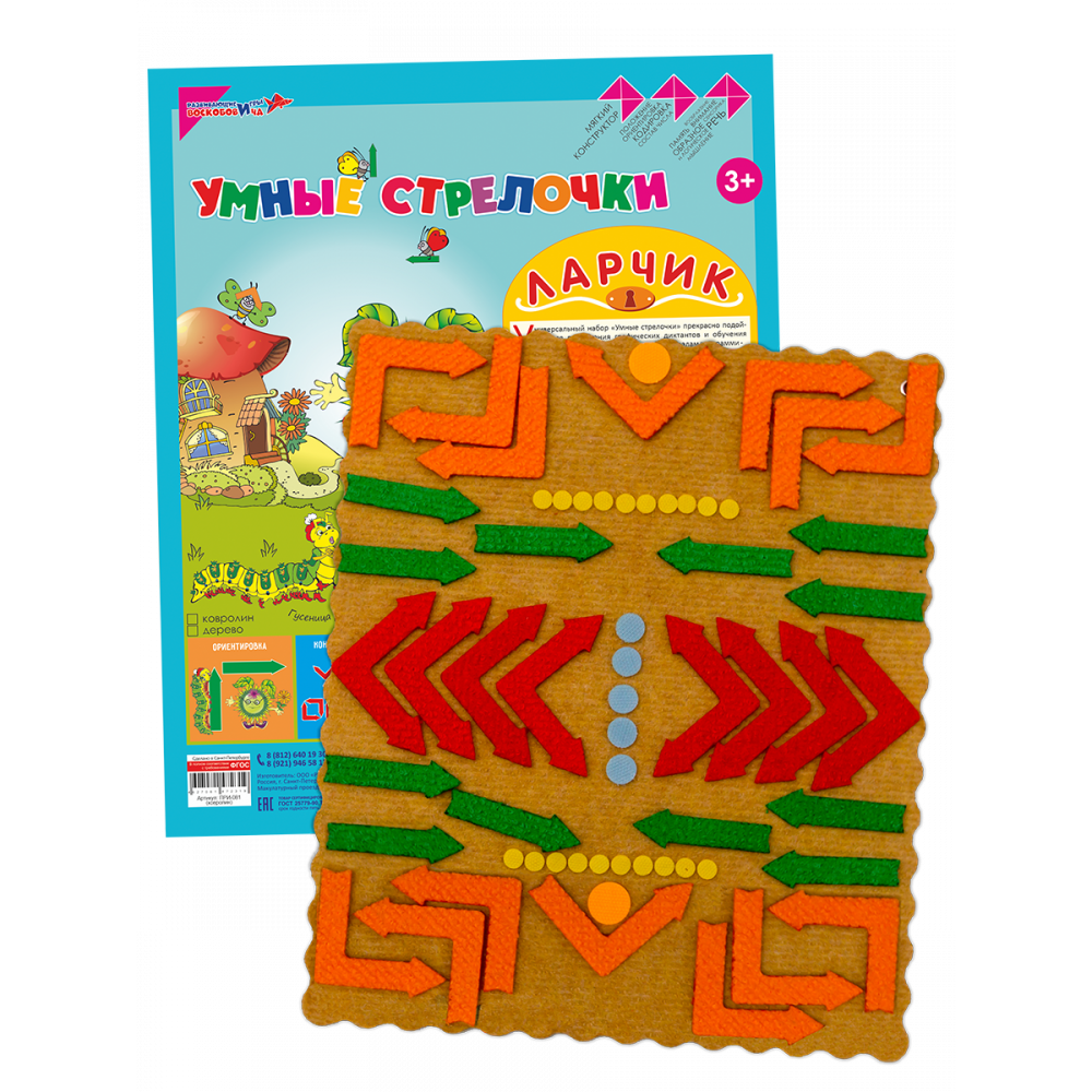 «Умные стрелочки Ларчик» – пособие для проведения игр, основанных на алгоритмах движения, на «Коврографе Ларчик». Цветовое и графическое изображение стрелочек помогает использовать их многофункционально: зелёные стрелочки обозначают простое движение (вверх, вниз, влево, вправо); красные стрелочки – сложное движение (вверх-влево, вниз-влево, вверх- вправо, вниз-вправо); оранжевые стрелочки – действие (ныряем, выныриваем, огибаем). Важно: в игровой форме ребенок овладевает множеством направлений движения.