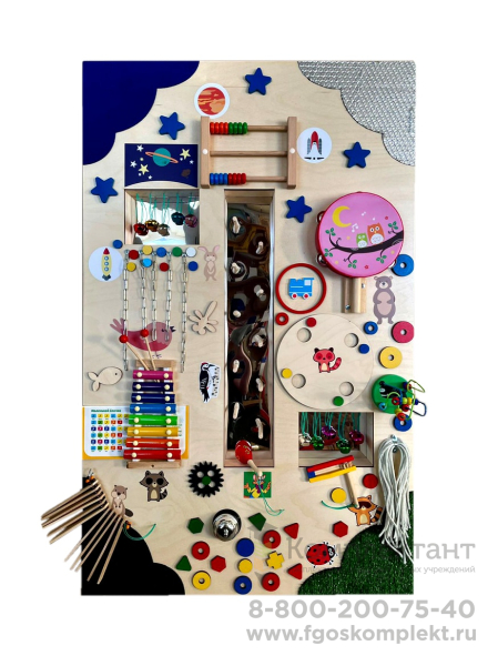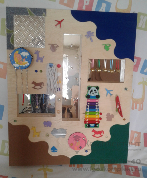 Изделие представляет собой панель, на которой размещены различные музыкальные инструменты, а также тактильные элементы разных форм и цветов. При игре с панелью дети знакомятся с различными звуками, открывают для себя новые ощущения.