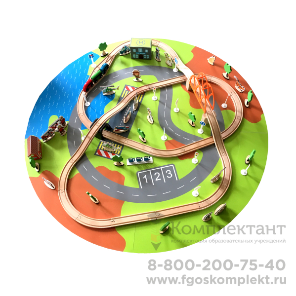 Изделие представляет собой круглую красочную панель, на которой расположена деревянная игрушечная железная дорога. Также на панели расположены и другие элементы: фигурки людей, стол, деревья, домики, дорожные знаки, машины, поезда, мостик и др.