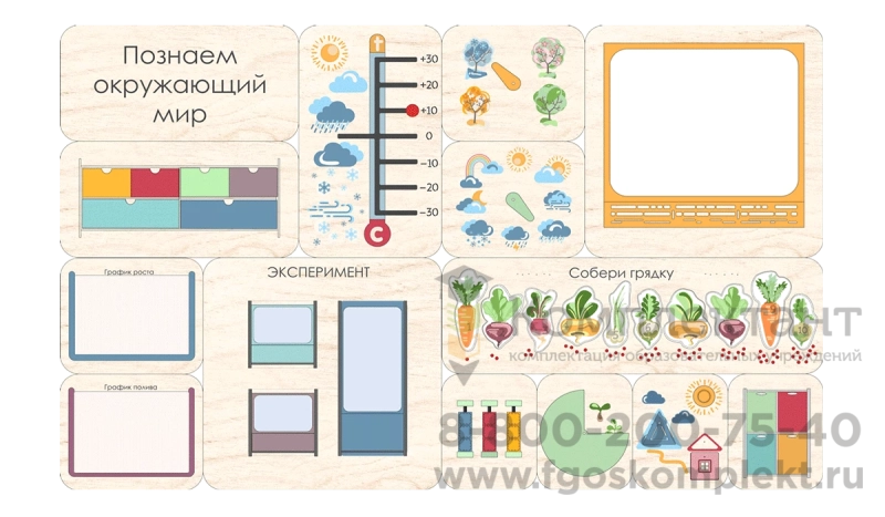 Дидактическая настенная панель АЛМА “Познаем окружающий мир” состоит из 15 образовательных модулей.