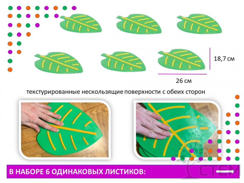 Наш набор из 6 ярких цветных листьев прекрасно подходит для детей, чтобы поиграть в прогулку через лес. Листья сделаны из прочного пластика с мягкой не скользящей поверхностью. Размер листика 260 x 187 x 5мм.
