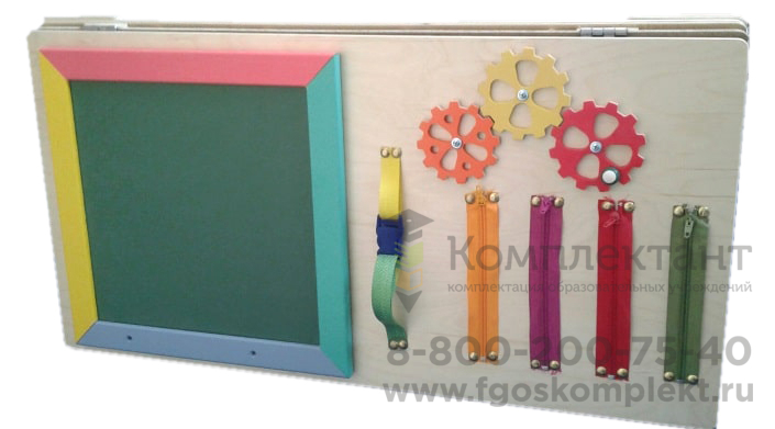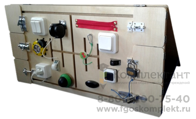 Развивающая доска, на которой размещено множество различных небольших бытовых вещей или их имитаций, с которыми можно проделывать определенные действия руками. Изделие служит для развития мелкой моторики, улучшает причинно-следственные связи, тактильные ощущения для слабовидящих и незрячих детей.