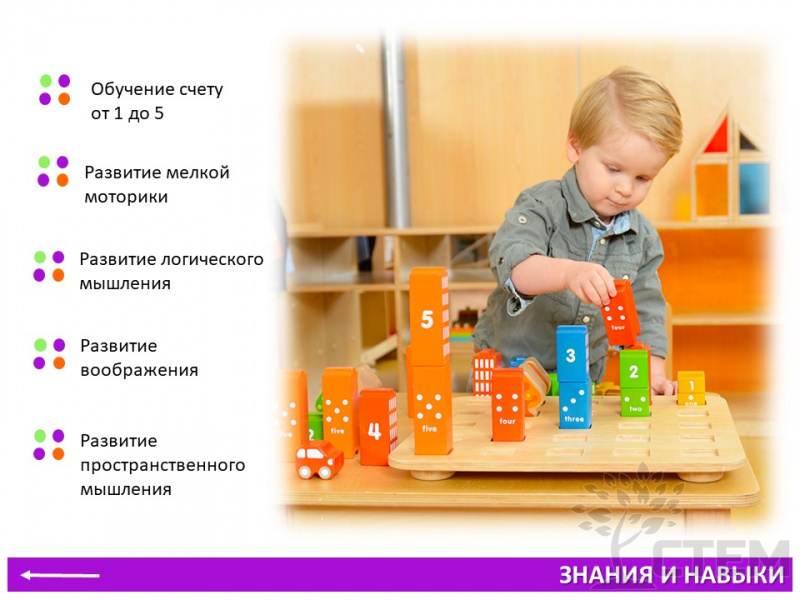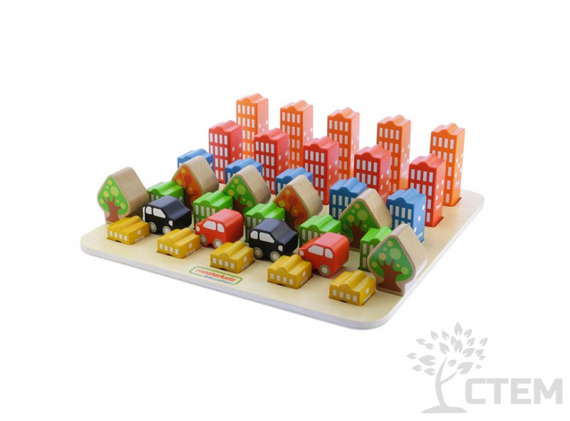 - 25 зданий пяти разных высот (каждое здание имеет количественную маркировку в виде точек от 1 до 5, соответствующую цифровую маркировку от 1 до 5 и обозначение цифры на английском языке),