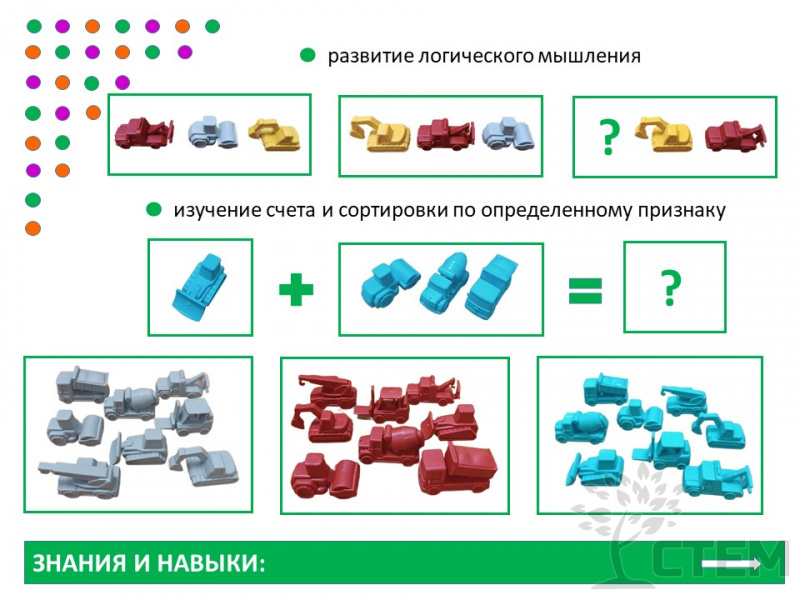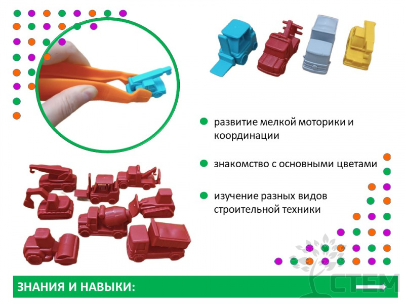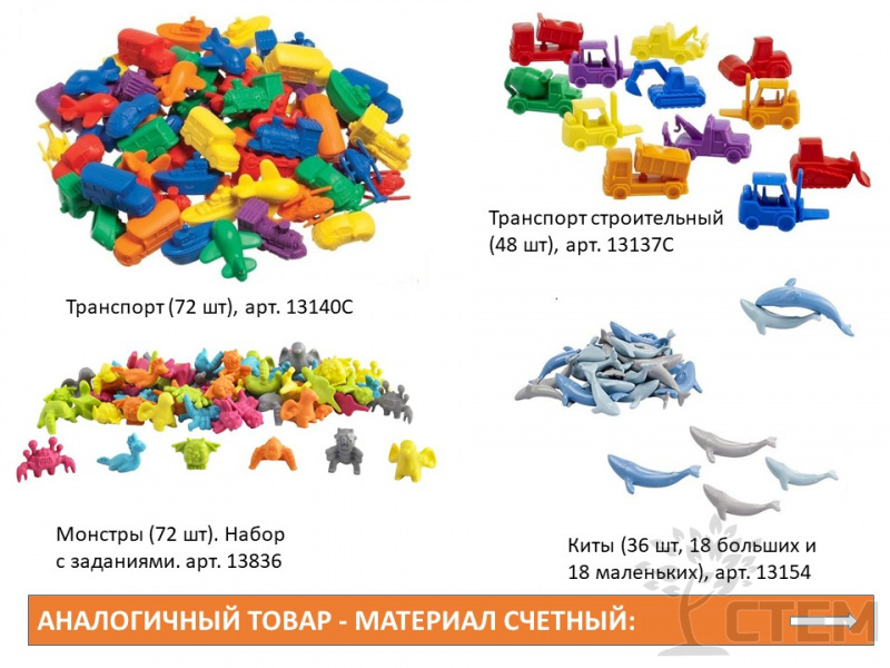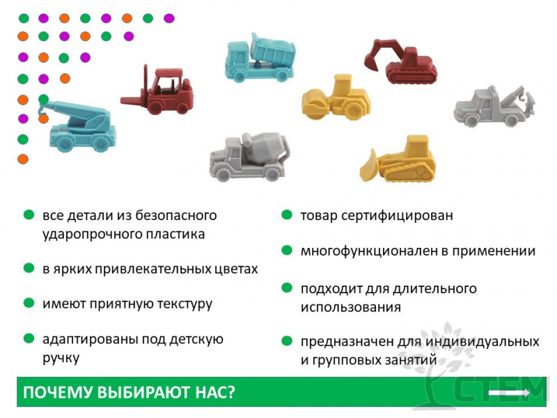 Набор счётный материал "Транспорт строительный" предназначен для развития мелкой моторики, математических способностей, навыков коммуникации, знакомит с основными видами строительной техники. С его помощью ребенок учится считать, сортировать по определенному признаку, развивает усидчивость и терпение.