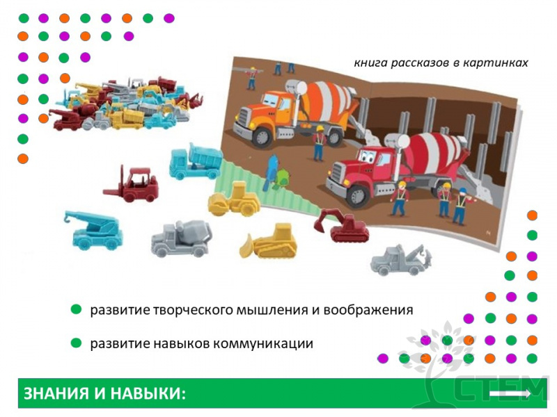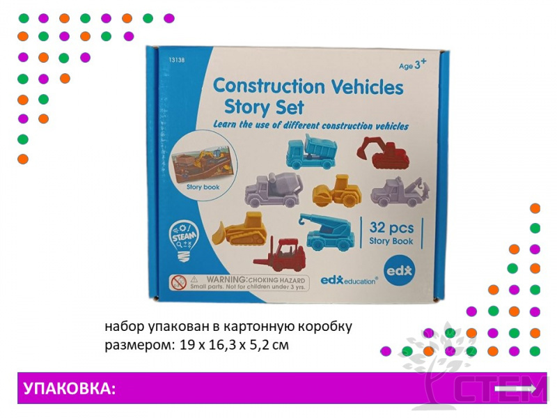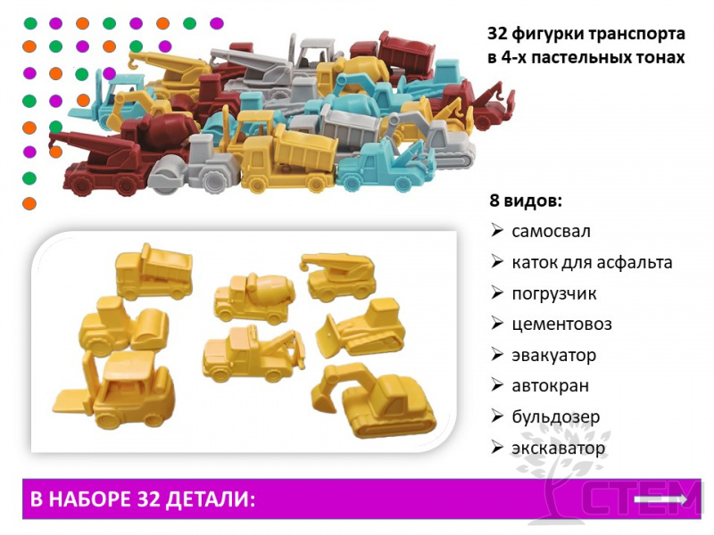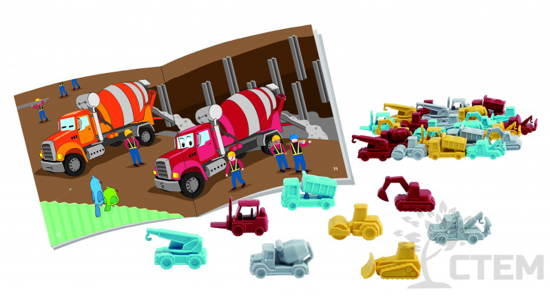 В наборе 32 фигурки транспорта 8 видов в 4-х пастельных тонах и книга рассказов о строительной технике в картинках.