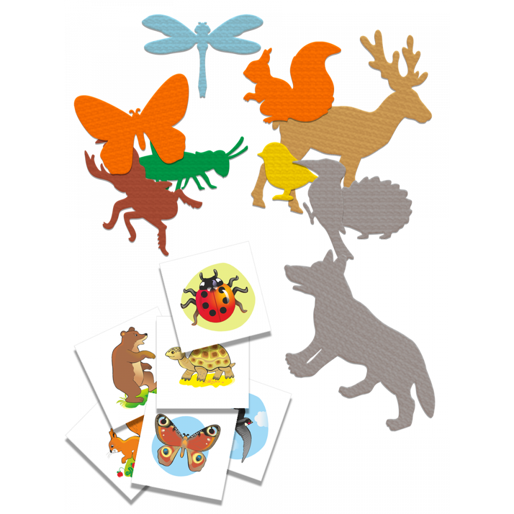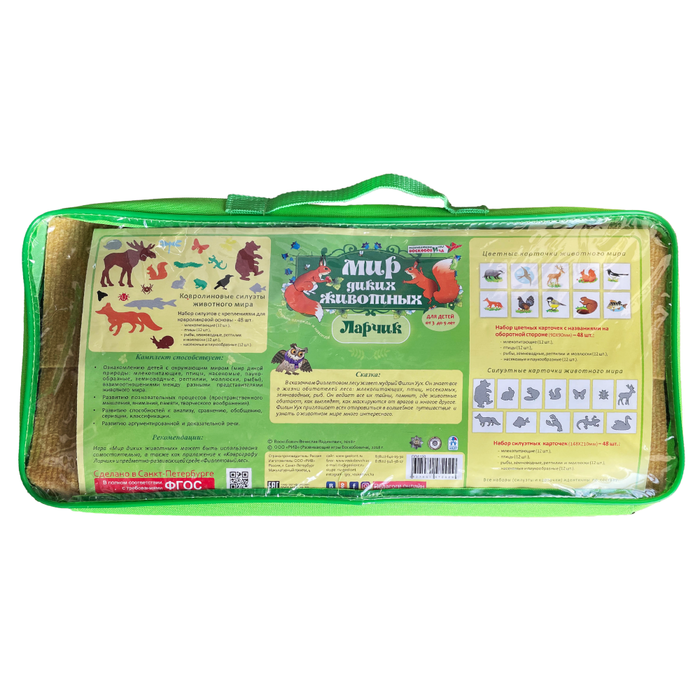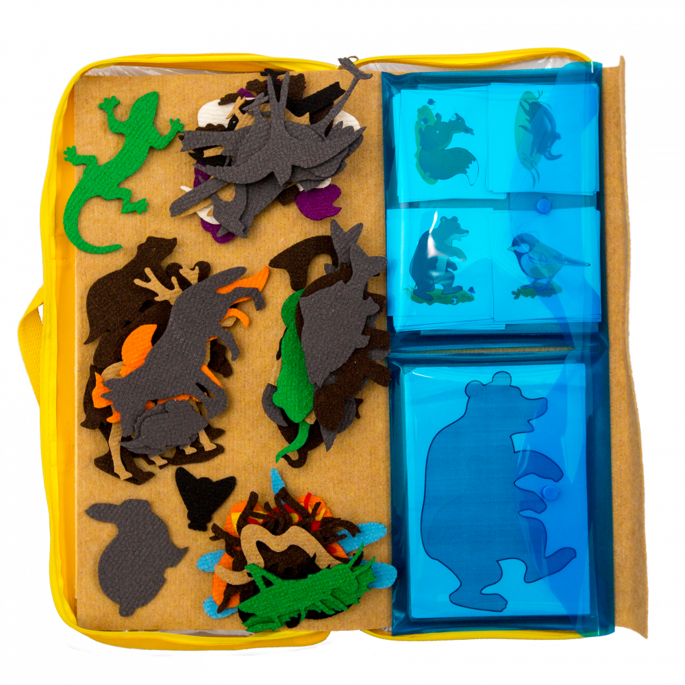 Контурные фигуры животных можно крепить к ковролиновой основе при помощи липучки, соотносить их с силуэтным и цветным изображением на карточках. Играя, ребёнок познакомится с представителями животного мира, научится классифицировать, сравнивать, составлять описательные рассказы, увлекательные истории. Надписи на обратной стороне карточек будут мотивировать ребёнка к овладению чтением.