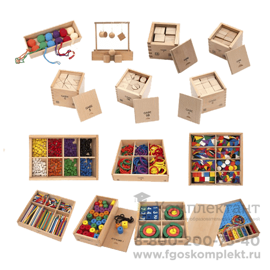 Набор Фребеля 14 модулей с методическими пособиями состоит из деревянных коробочек в которых находятся кубики, треугольники, круглые диски, клубочки и т.д.
