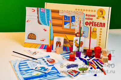 Набор разработан в соответствии с педагогическими принципами Фребель-педагогики и представляет собой специально составленные комплекты из элементов «Даров Фребеля» с авторскими иллюстрациями по мотивам сказок русских писателей. Карточки изготовлены из мелованной бумаги, ламинированной пленкой. Печать полноцветная. Элементы для игры изготовлены из дерева и пластика и упакованы в зип-пакеты.