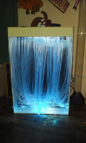 Изделие представляет собой фиброоптическое панно: на её задней части расположено безопасное зеркало, а спереди подвешены фиброоптические волокна.