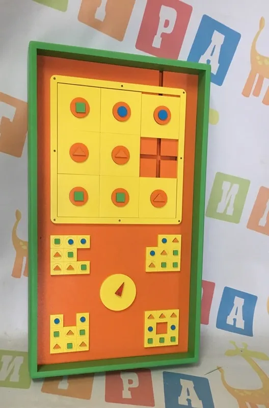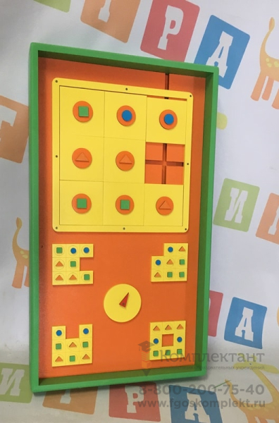 Изделие представляет собой настенную панель, на которой расположены развивающие элементы. Цель игры: с помощью стрелки выбрать выбрать одну из четырёх комбинаций на нижней части панели и составить такую комбинацию на верхней части панели.