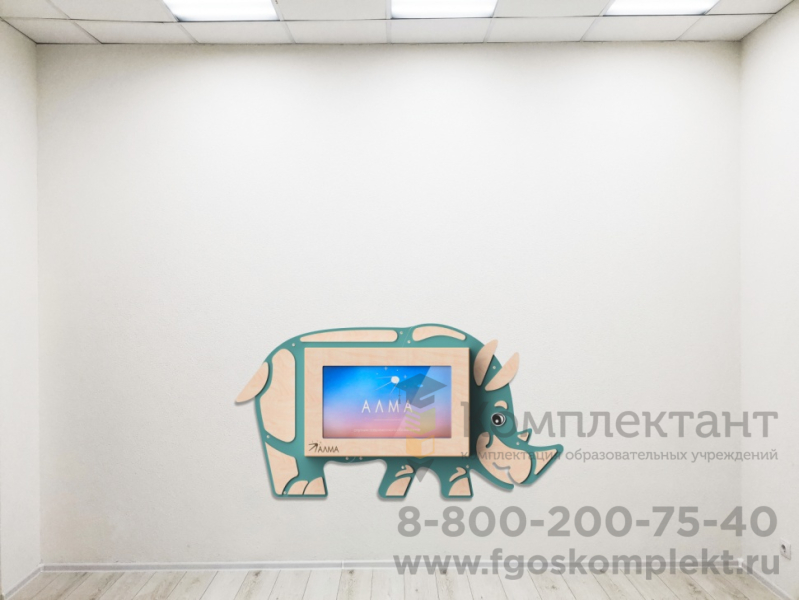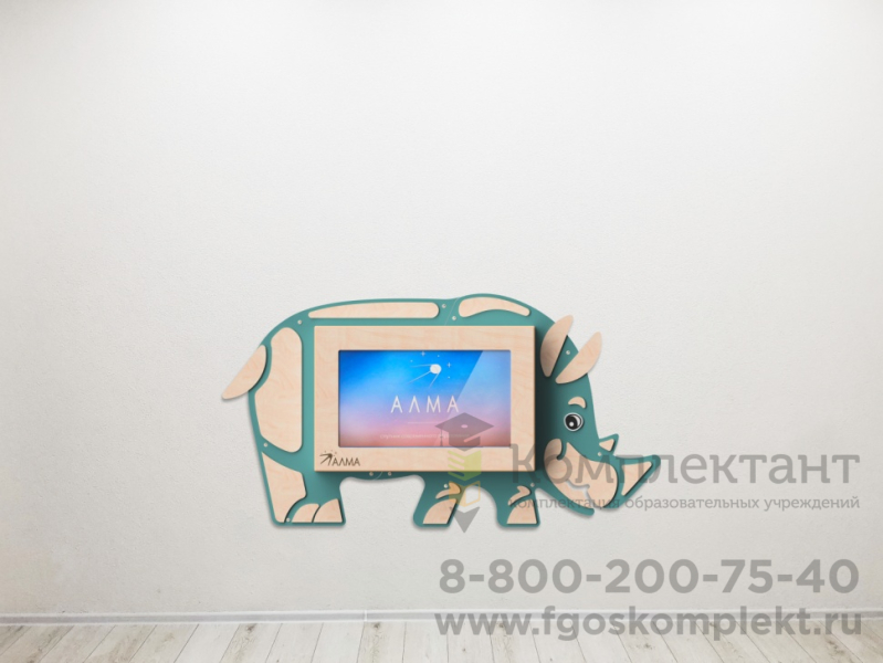Настенная панель «Носорог» со встроенной интерактивной сенсорной панелью 32 дюйма. Это одновременно декоративное оформление стен и развивающая игрушка, ведь на панели установлен пакет игрового и обучающего ПО от АЛМА.