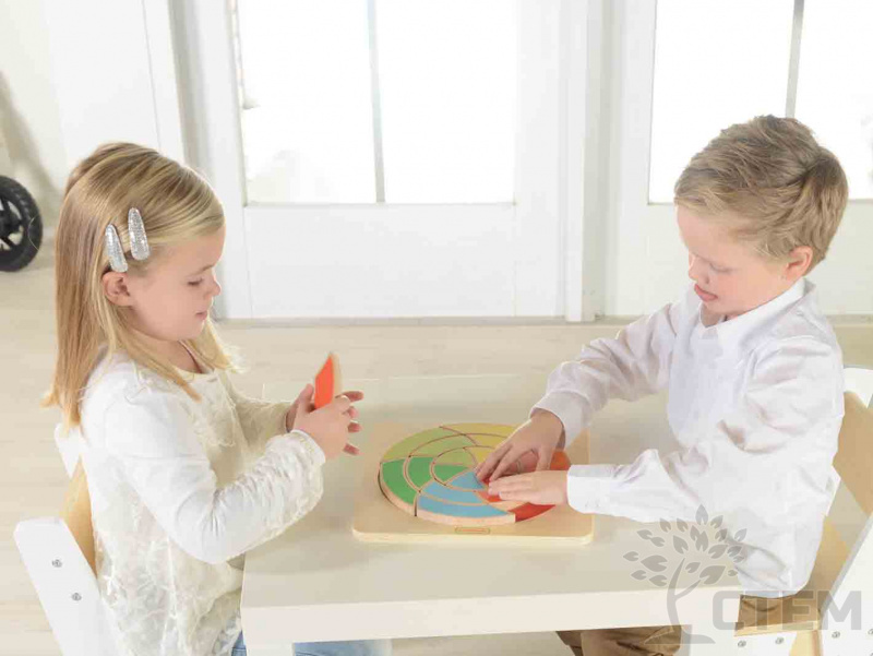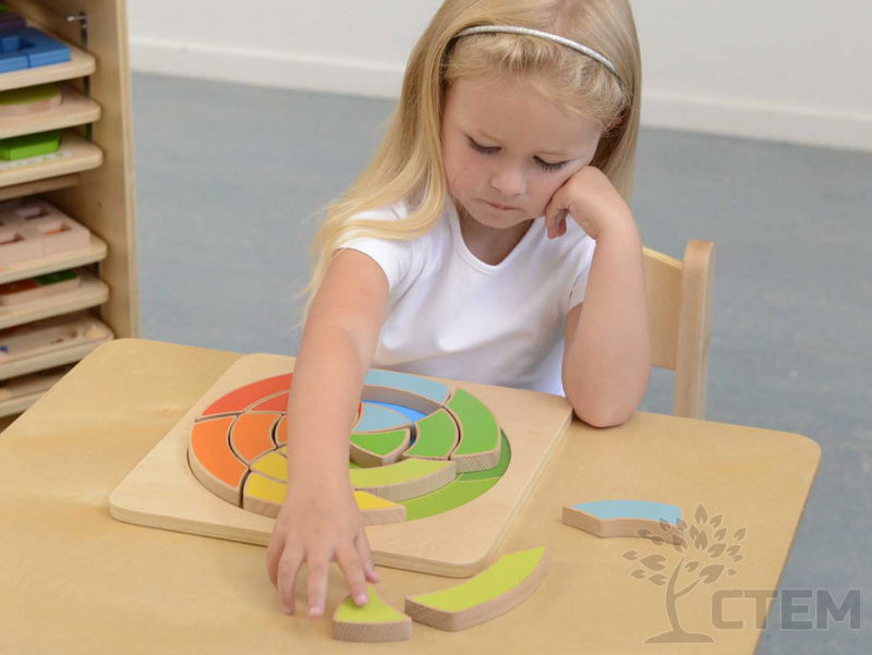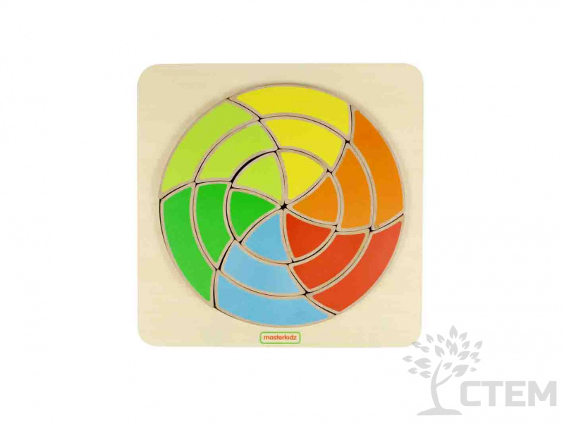 На поверхности панели представлены 18 деревянных блоков, изготовленных из массива бука в 6 цветах, образующих спиральный круг. Дети могут исследовать различные комбинации из 18 частей головоломки. Отличная игрушка для стимулирования творческого воображения и визуального развития.