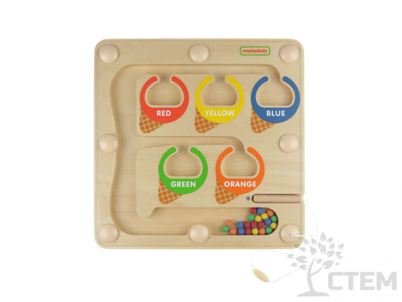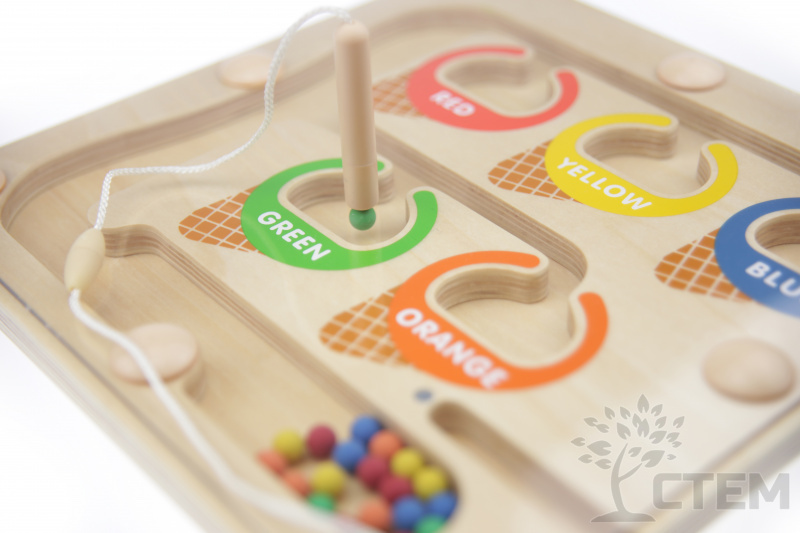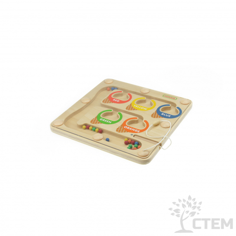 Панель выполнена из березовой фанеры, на поверхности которой в центре имеются углубления в форме мороженого в 5 цветах, в нижней части цветные шарики с магнитной палочкой. Предназначена для сортировки в соответствии с цветом.