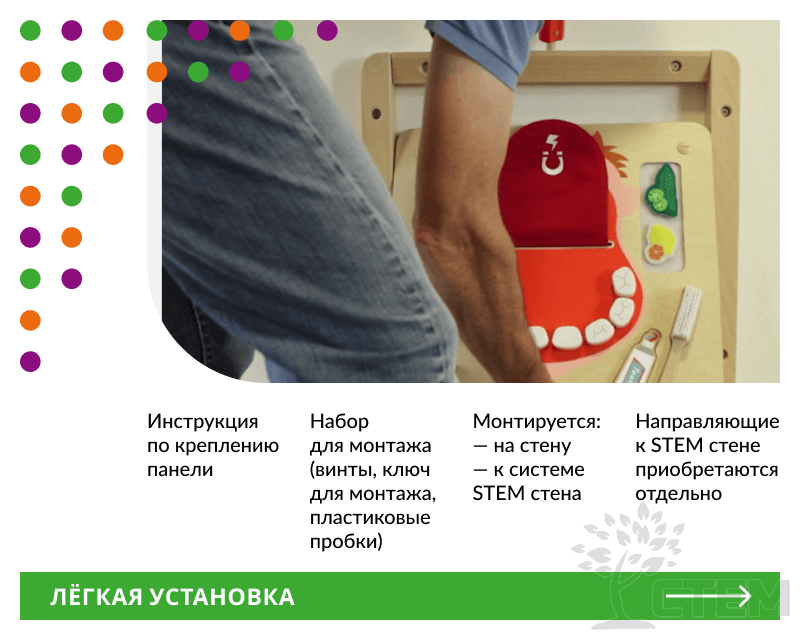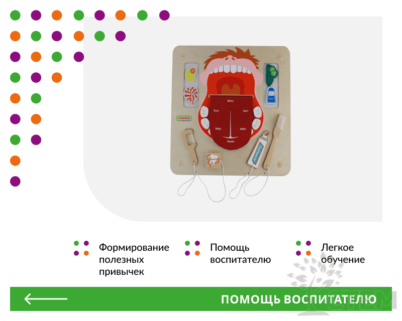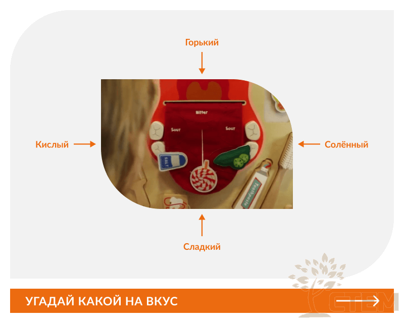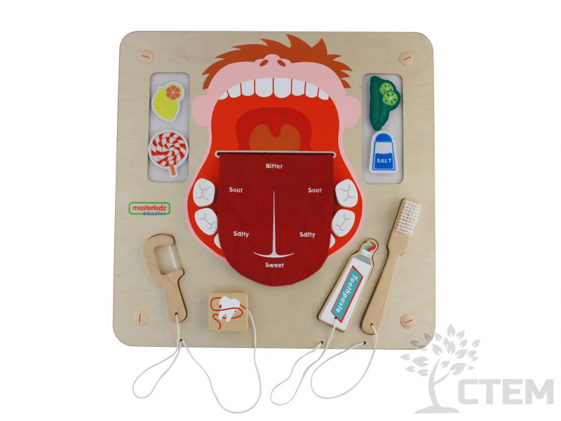 На лицевой части панели изображена ротовая полость человека, с нижним рядом зубов, выполненных из пластика. По центру ротовой полости размещен макет языка, выполненный из текстиля красного цвета. На языке изображены области, отвечающие за восприятия вкусов. В комплекте поставляется макет зубной щетки, зубной пасты, зубочистки, зубной нити, а также солонки, леденца, лимона и огурца. Данные элементы крепятся на доске в специальных углублениях.Панель выполнена из березовой фанеры толщиной 18мм.