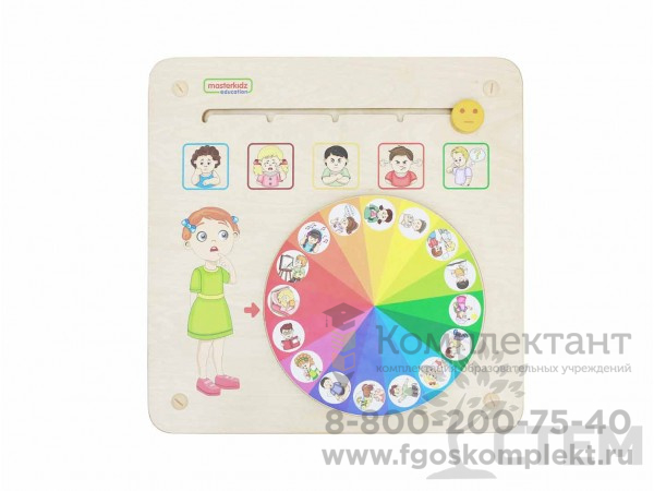 На поверхности панели смонтирован подвижный круг, поделенный на 16 цветных сегментов с изображением различных занятий, вызывающие разнообразные эмоции. В верхней части панель имеет прорезь с 5-ю ступенями для фиксации. В прорези передвигается цилиндр, с помощью его можно обозначит ту и иную эмоцию.