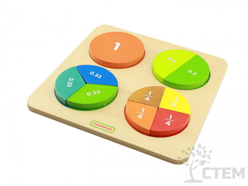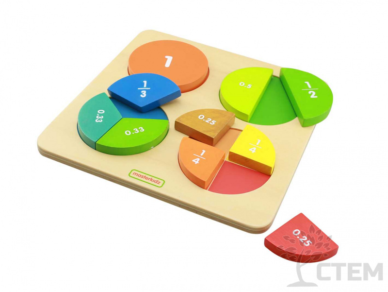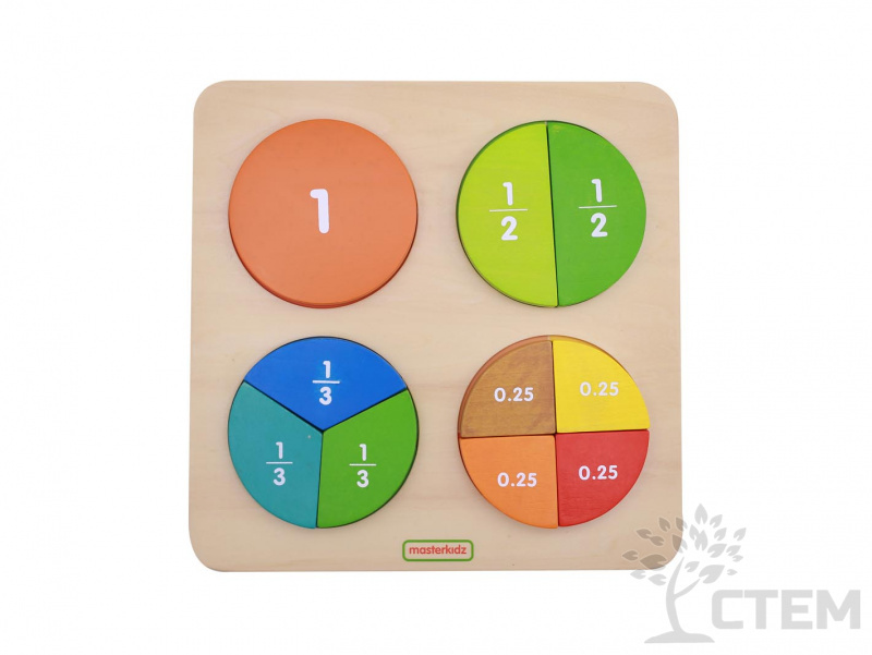 Панель для легкого изучения дробей. Дроби и цифры напечатаны с двух сторон каждого блока. Все блоки изготовлены из FSC-сертифицированного европейского бука.