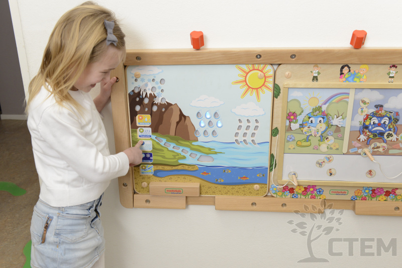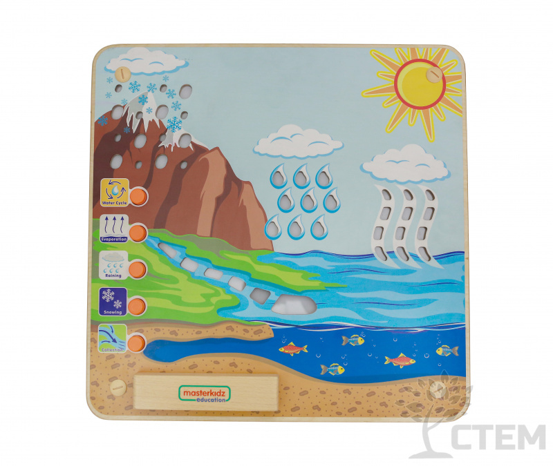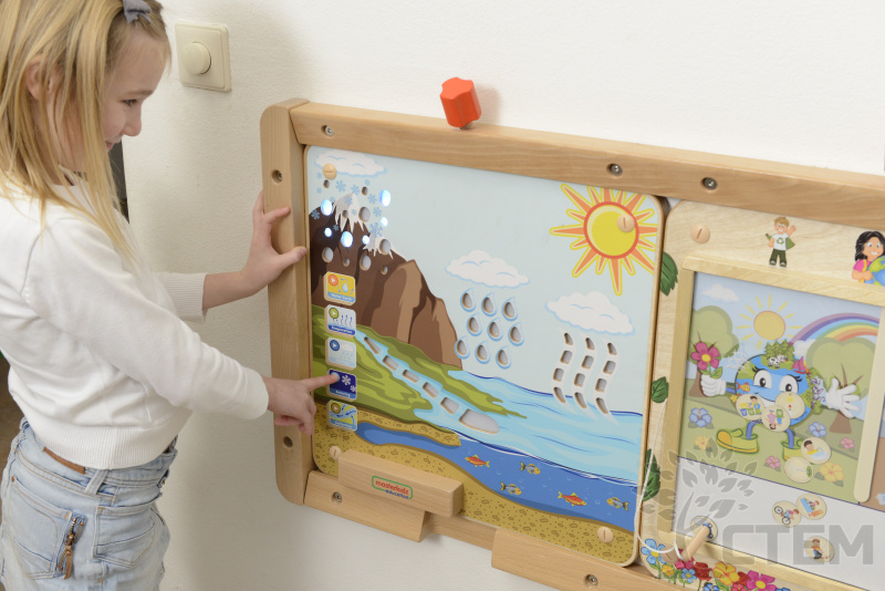 Панель знакомит детей с водным циклом (круговоротом воды) на нашей планете. Световые эффекты наглядно демонстрируют процесс круговорота воды по различным осадкам: снег, дождь.