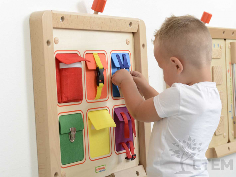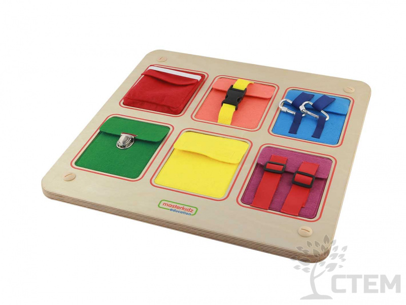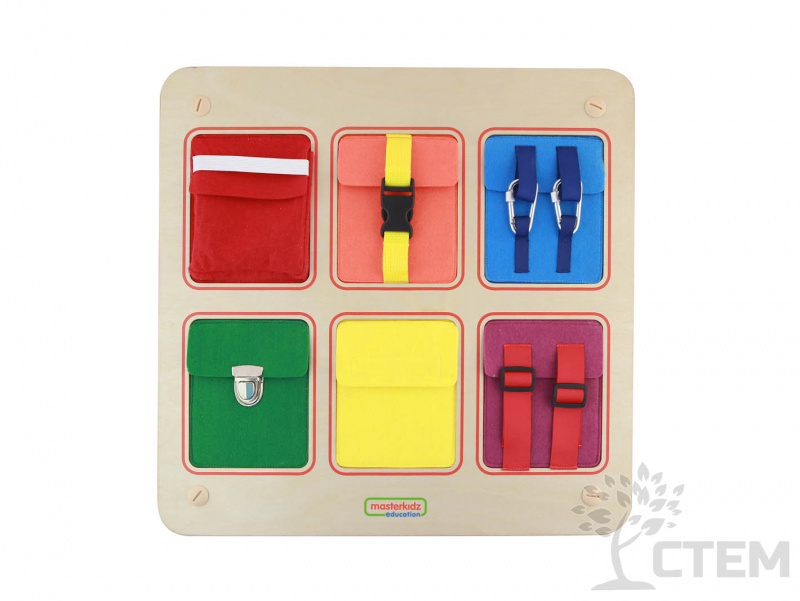 Панель выполнена из березовой фанеры. На лицевой поверхности которой выполнены углубления, в которых зафиксированы чехлы из ткани в 6 разных цветах с различными типами застежек. Количество чехлов 6, типов застежек 6. По углам панели размещены отверстия для крепления панели к стене.