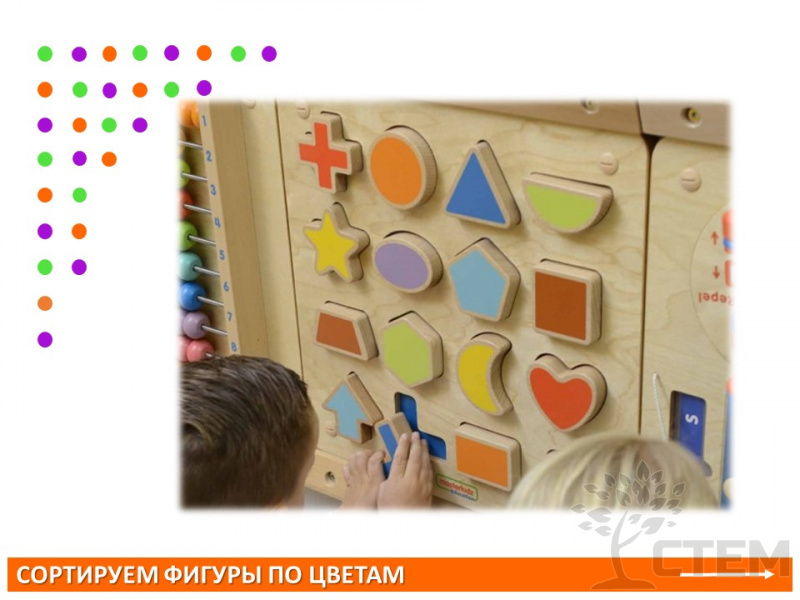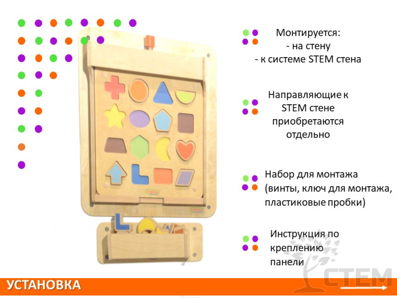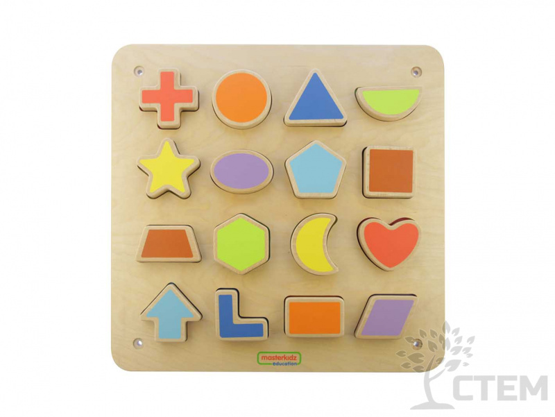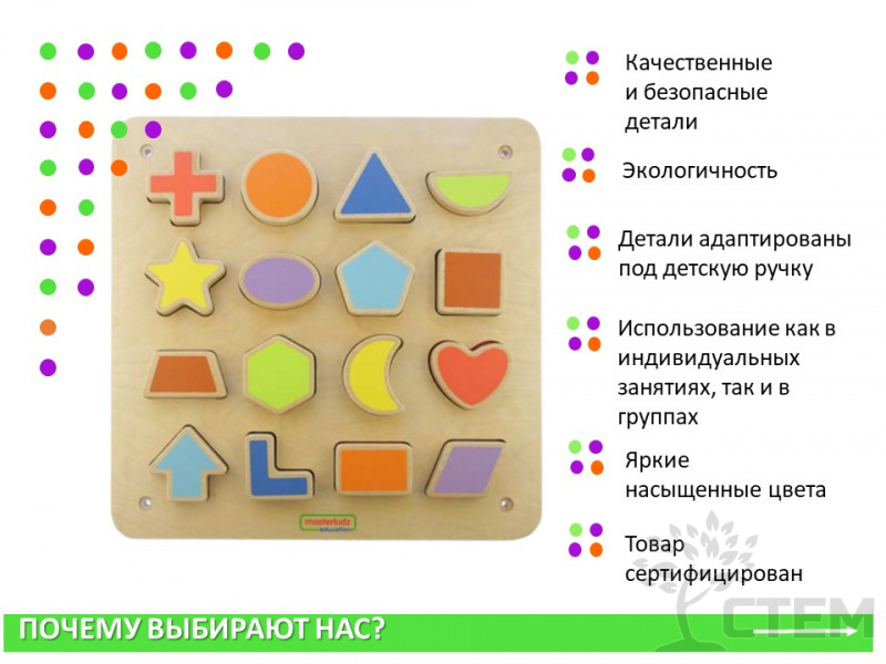Интерактивная доска-панель выполнена из березовой фанеры, на лицевой части которой выполнены углубления, в которые вставляются фигуры различной геометрической формы. Формы выполнены в 16 разных цветах. Общий размер 46*46 см