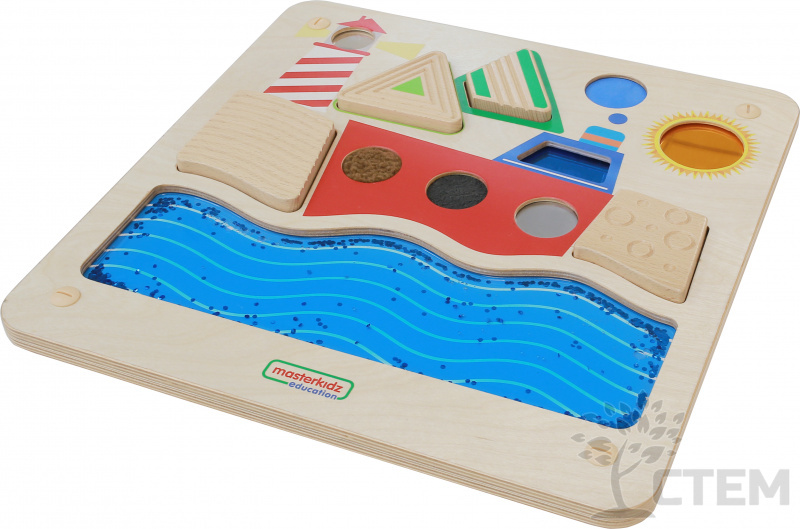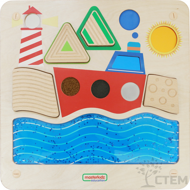 На лицевой части по основной площади, в углублениях расположены 4 образца деревянных плашек с различной текстурой поверхности, для тренировки тактильных навыков. Настенная панель выполнена из березовой фанеры толщиной 18мм., на лицевой части которой размещены углубления различной формы, в них размещены различные по тактильному восприятию материалы. Данная панель стилизованна под картину с океаном и идущим по нему кораблем.По углам панели размещены отверстия для крепления панели к стене