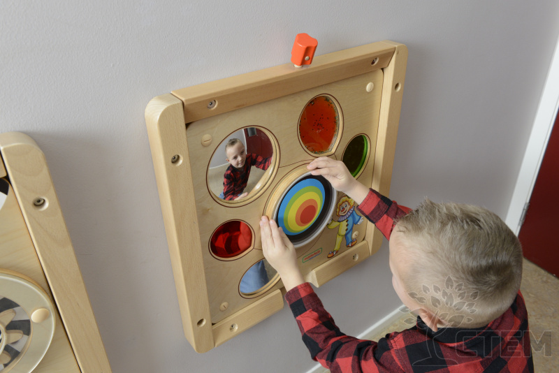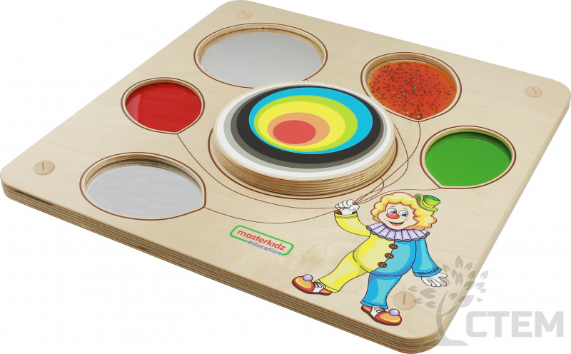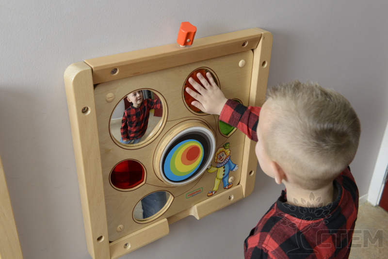 Основание настенной панели выполнено из березовой фанеры, на лицевой части которой расположены следующие элементы: зеркало, цветное отражение, вогнутое зеркало, тактильные окна, вращающее колесо. Способствует развитию мелкой моторики, сенсорики и концентрации внимания.
