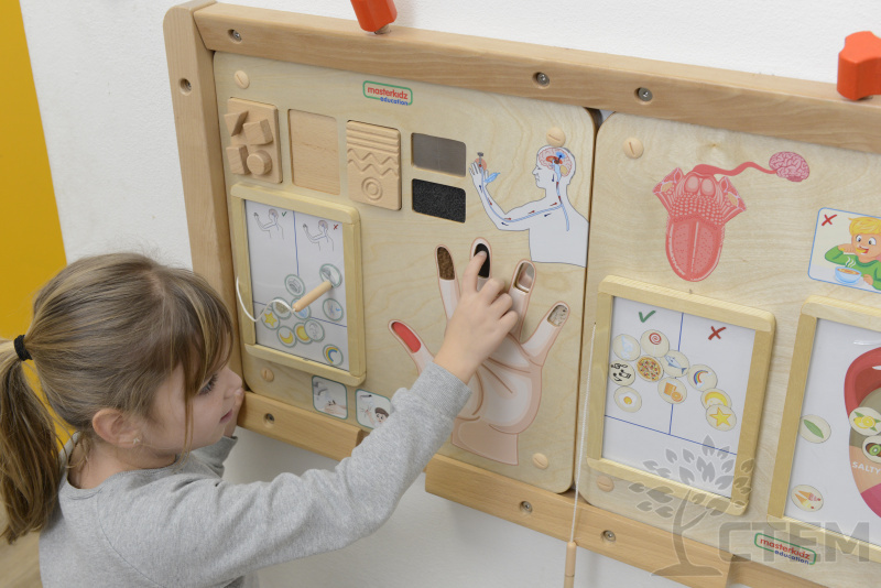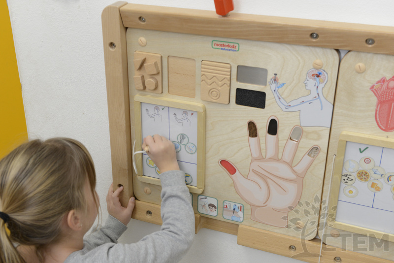 На лицевой части интерактивной панели расположена кисть руки, на кончиках пальцев нанесены различные образцы материалов. С помощью панели можно объяснить, что наша кожа является местом ощущения осязания, которое мы используем для определения шероховатости, гладкости, твердости, мягкости или различных форм объектов.