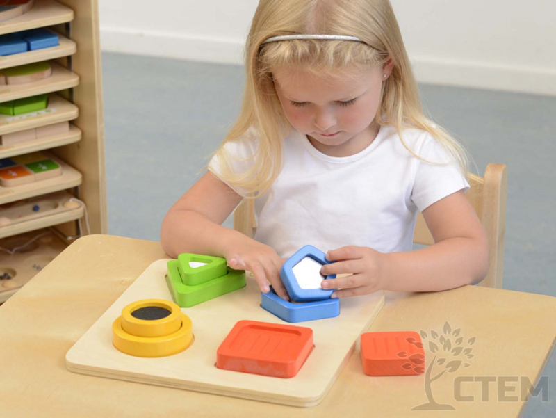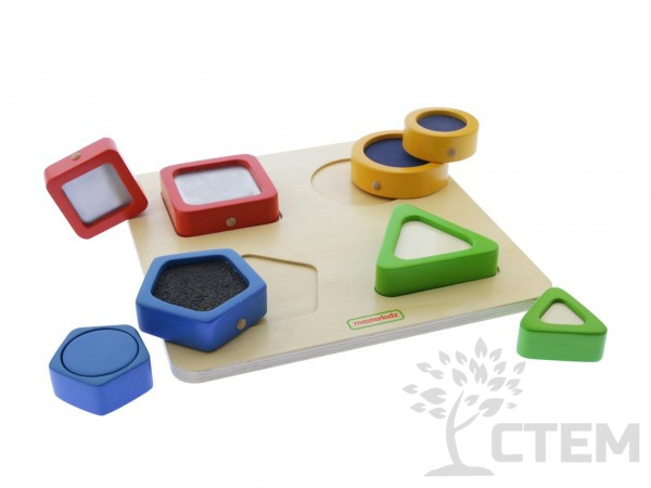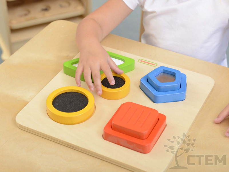 На лицевой части панели представлены 4 пары штабелируемых блоков с различными текстурами. Каждая пара имеет свою форму и цвет. Панель предназначена для развития тактильных и моторных навыков, логического мышления, а также для знакомства с формой и цветом.