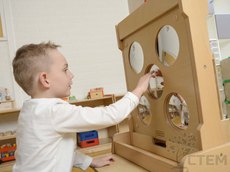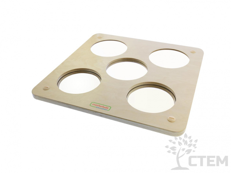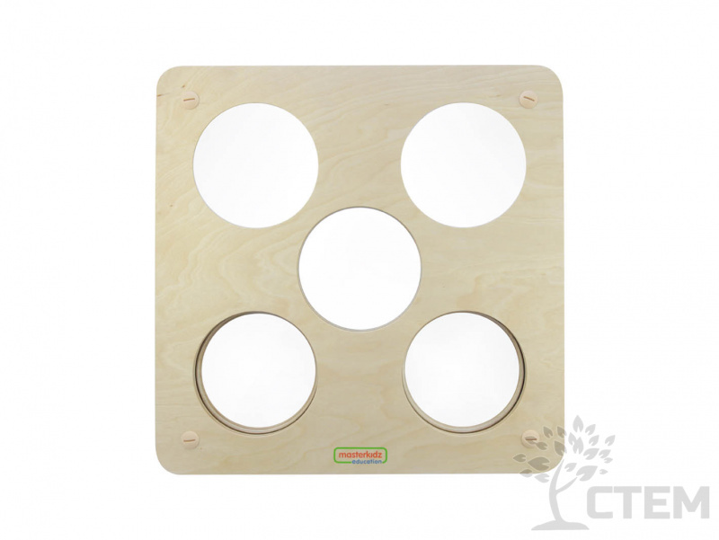 Пособие представляет из себя панель из березовой фанеры, в которую вмонтированы 5 зеркальных круглых поверхностей, с разной степенью кривизны. Общий размер панели 460*460 мм.